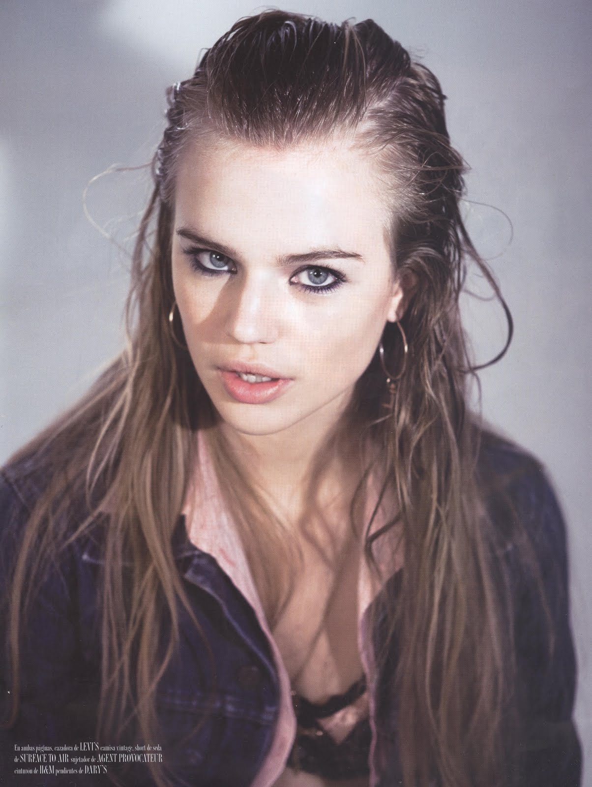 Description: A woman with long hair and a shirt on posing for a picture with her eyes closed and a serious look on her face.