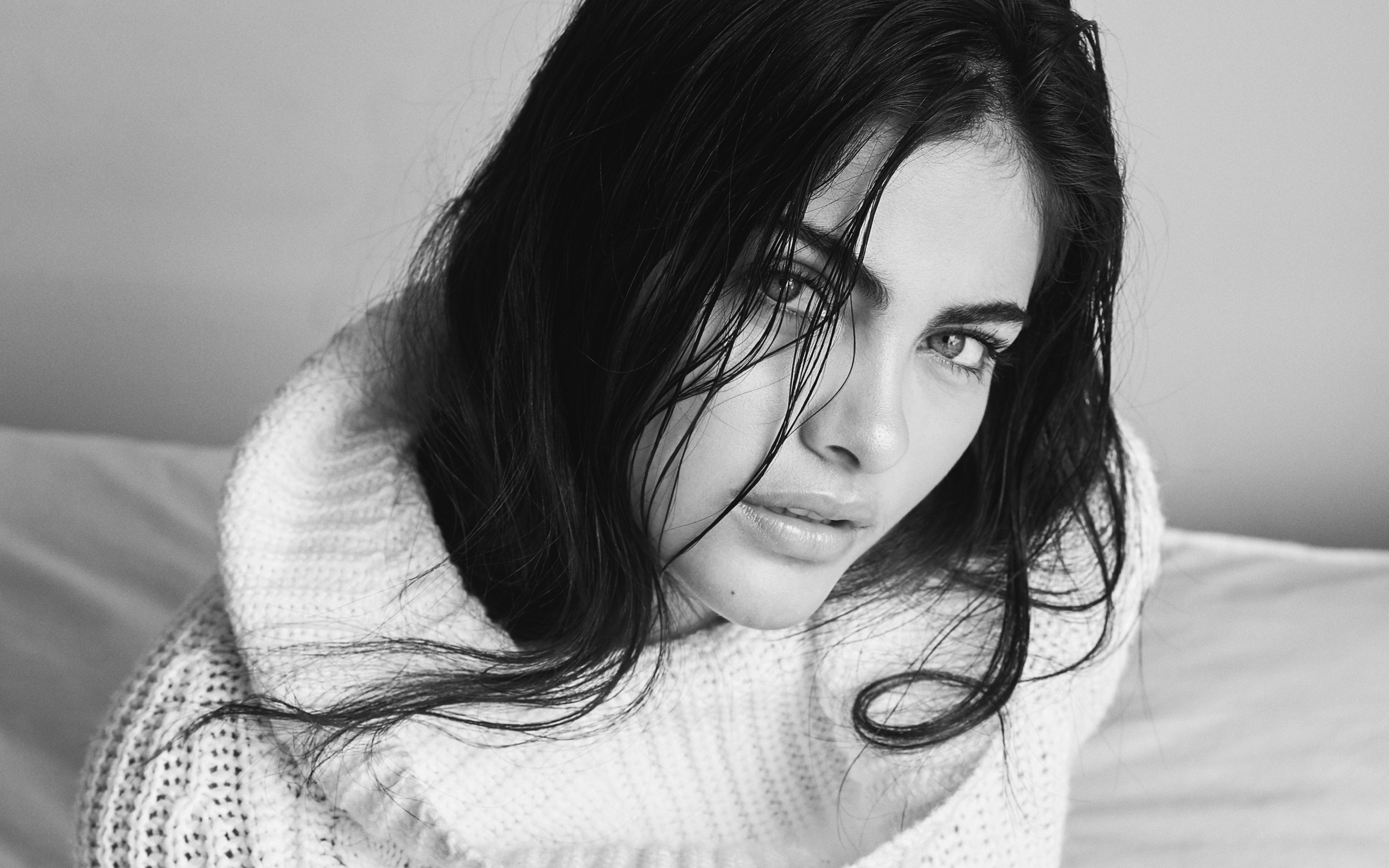 Description: A woman with long hair is sitting on a bed wearing a sweater and a scarf over her head and looking at the camera.
