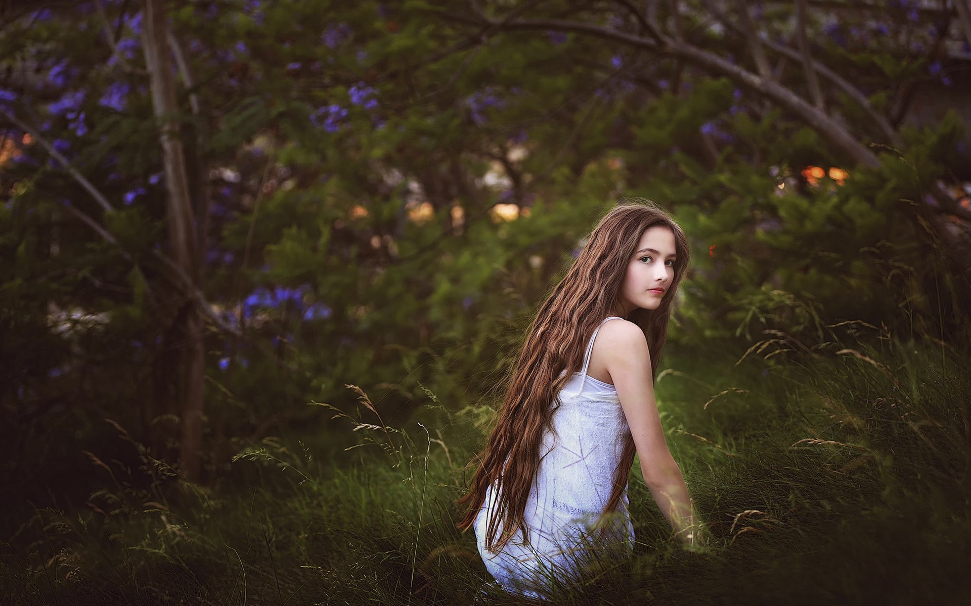 Description: A woman with long hair sitting in a field of grass and trees in the background.