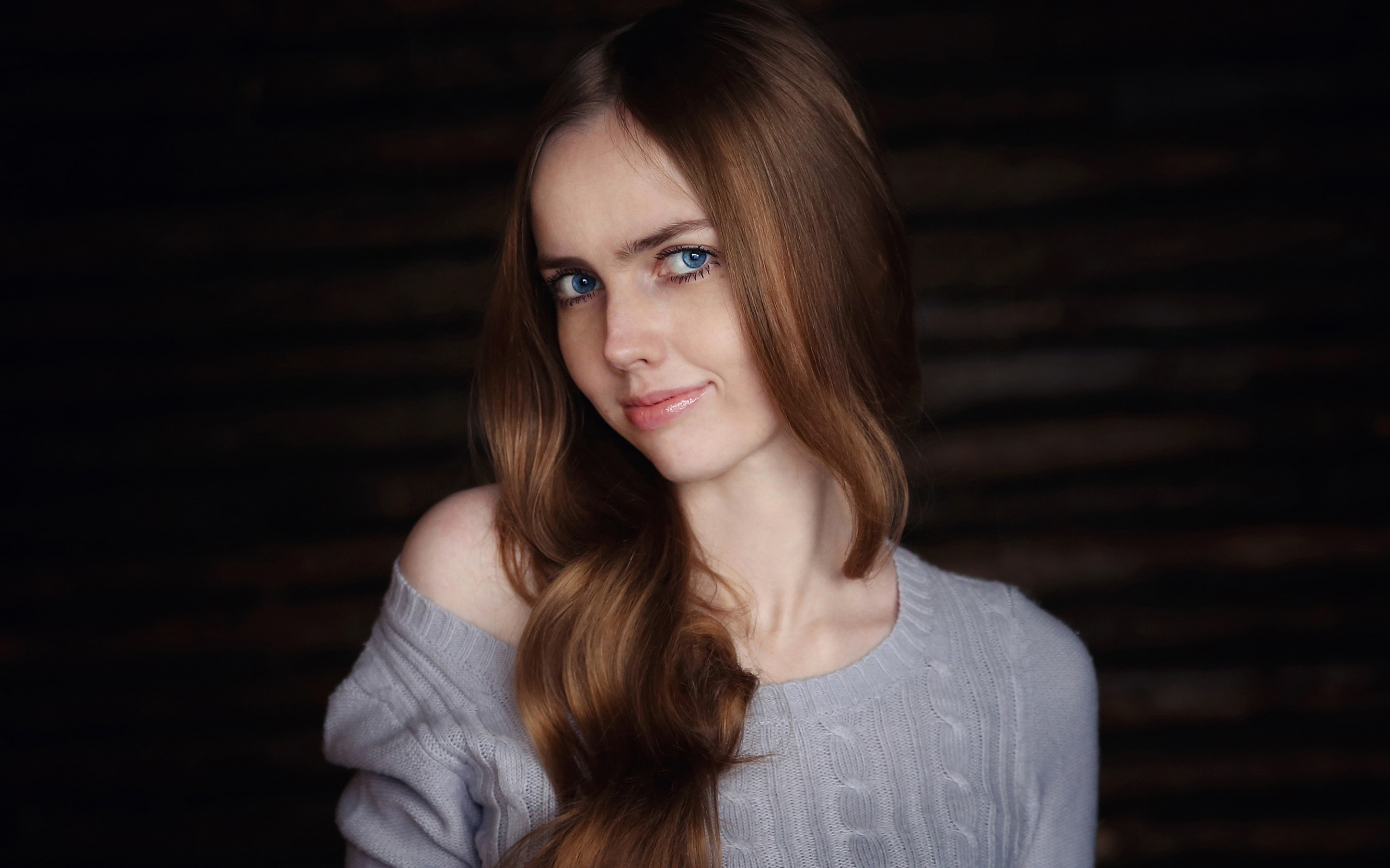 Description: A woman with long hair is posing for a picture in the dark with a smile on her face and blue eyes.