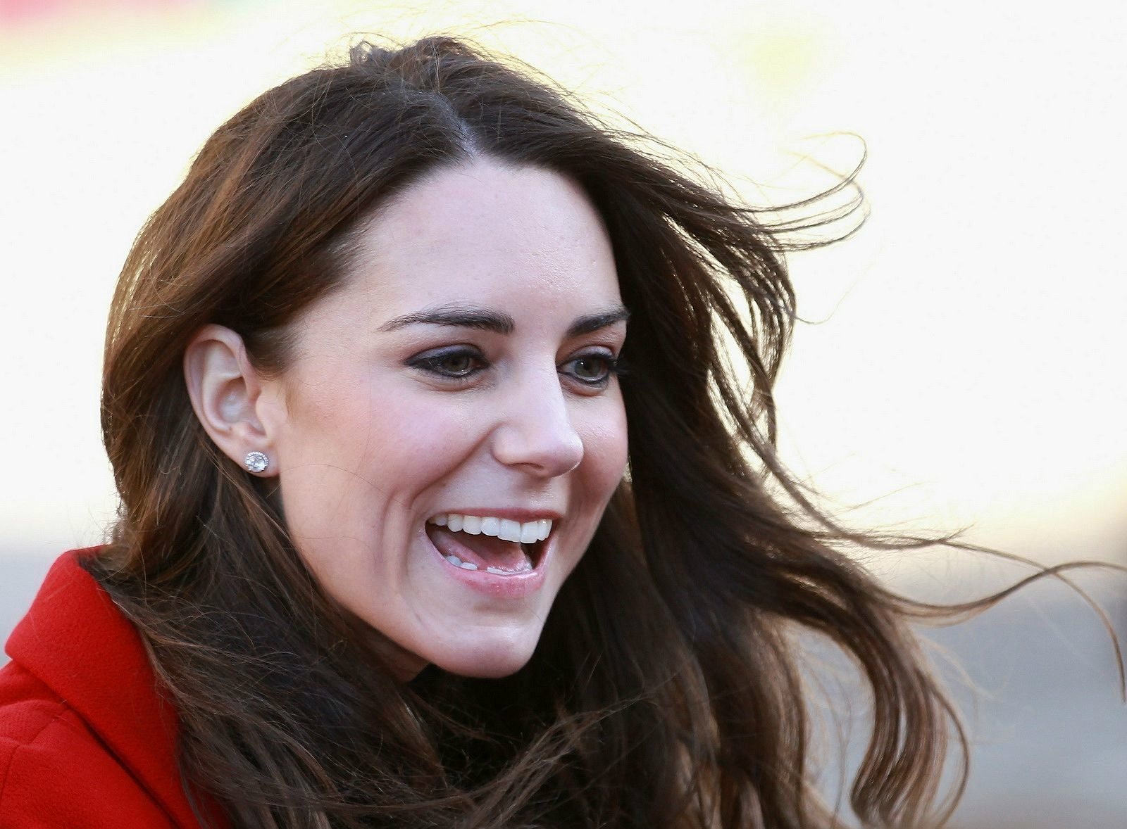Description: A woman with long hair smiling and wearing a red coat and a red coat over her shoulders and a red coat over her shoulder.