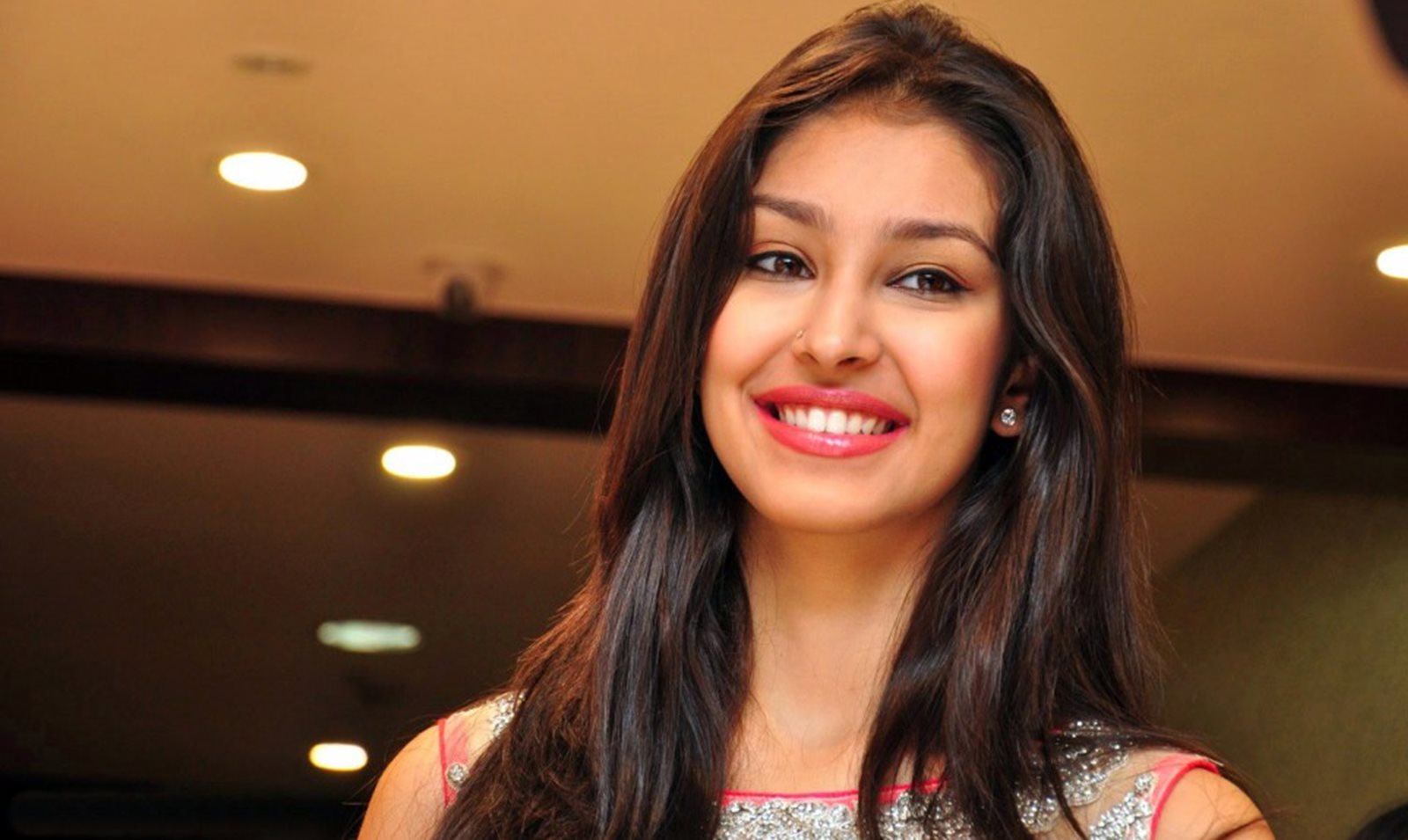 Description: A woman with long hair smiling at the camera with a smile on her face and a red lip and a white dress.