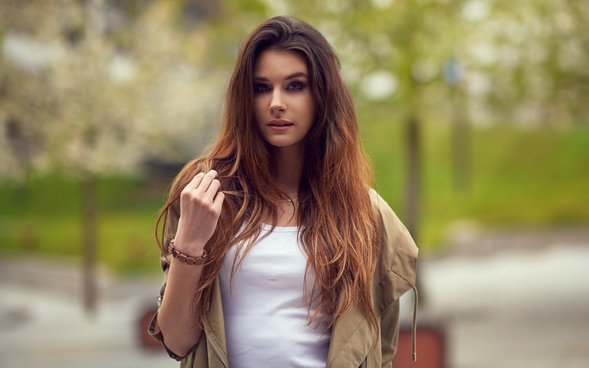 Description: A woman with long hair is standing in the street and holding her hand up to her ear and looking at the camera.