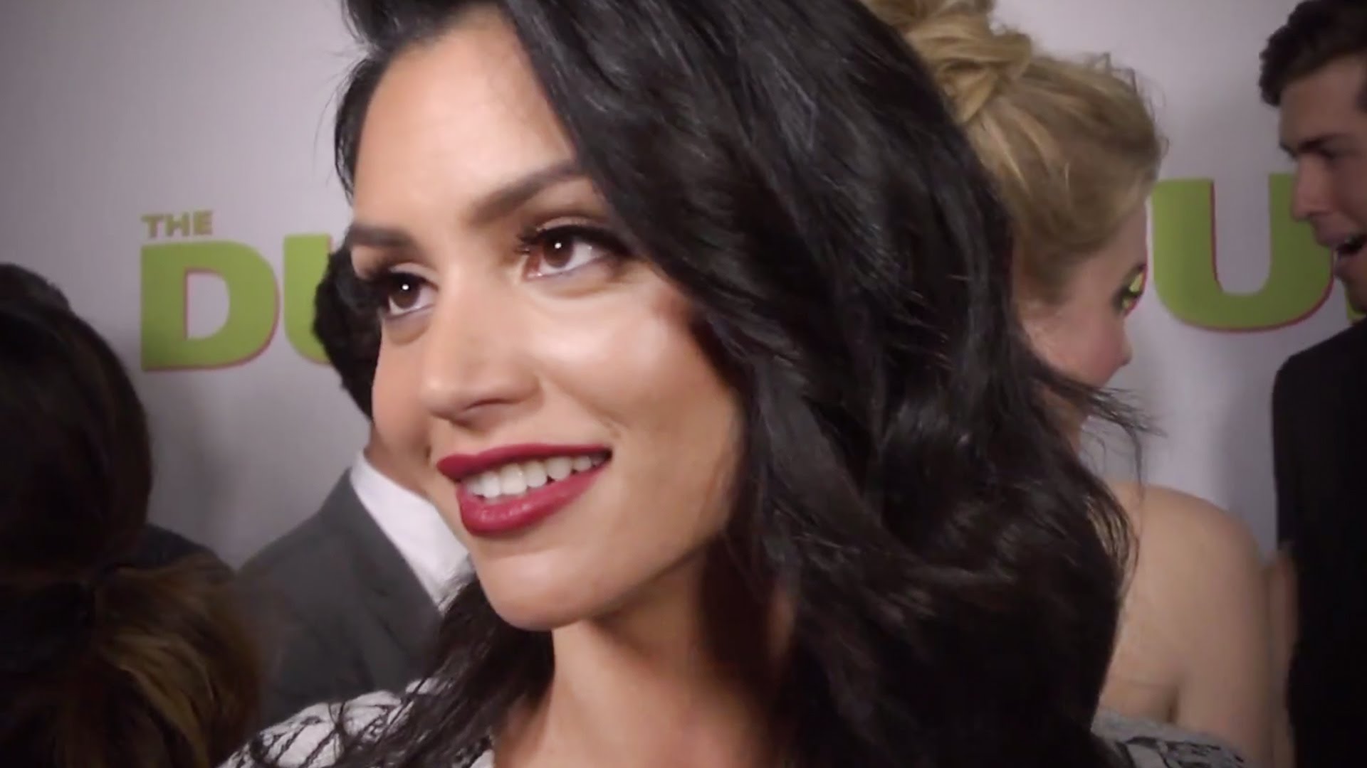 Description: A woman with long hair and a suit on at a red carpet event smiling at the camera with other people in the background.