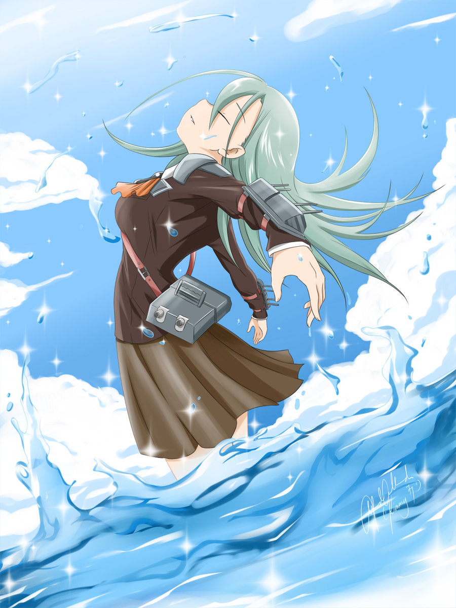 Description: A woman with long hair and a suitcase in the air above a wave of water with a sky background.