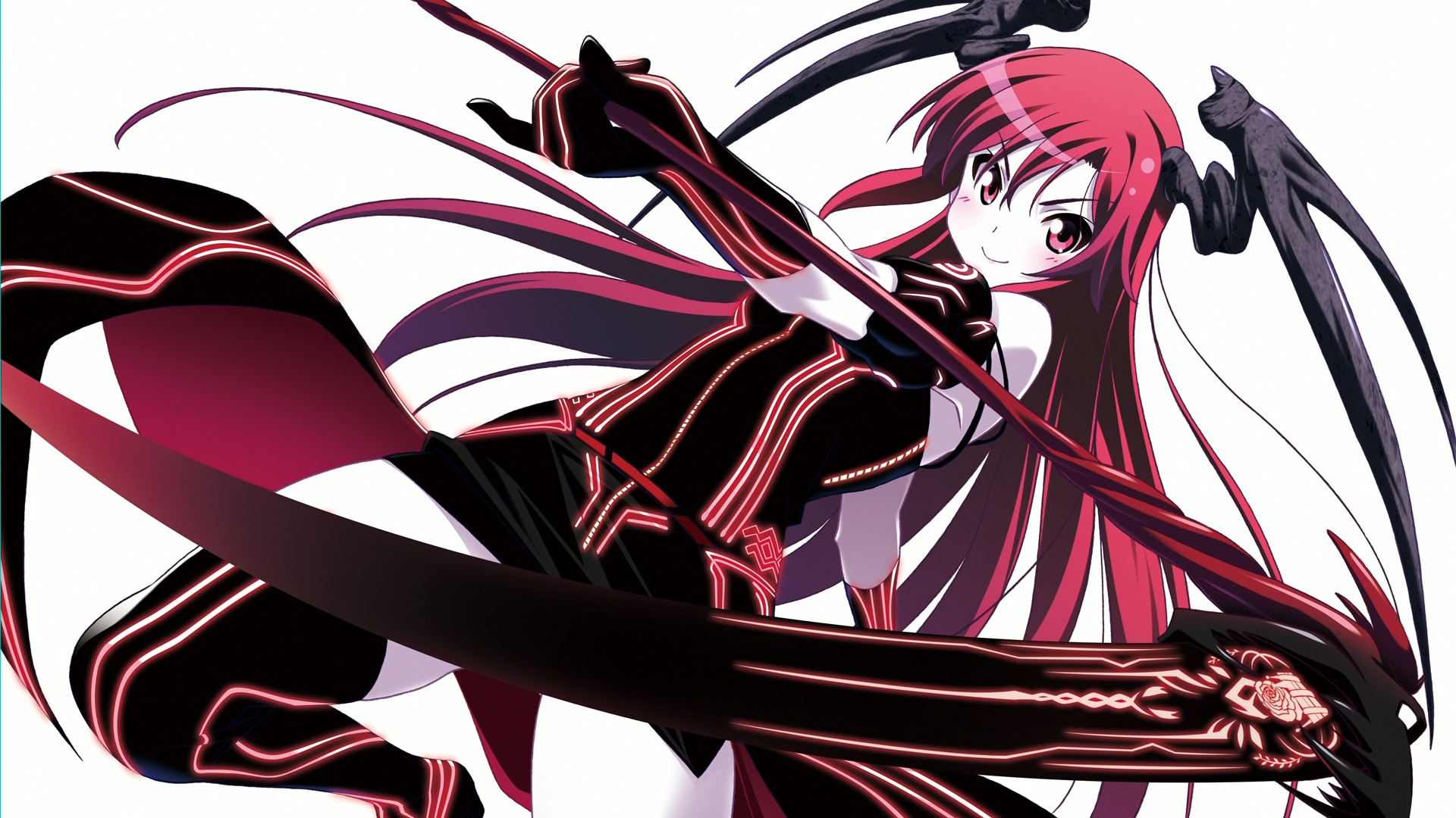 Description: A woman with long hair holding a sword in her hand and wearing a black outfit with red trims.