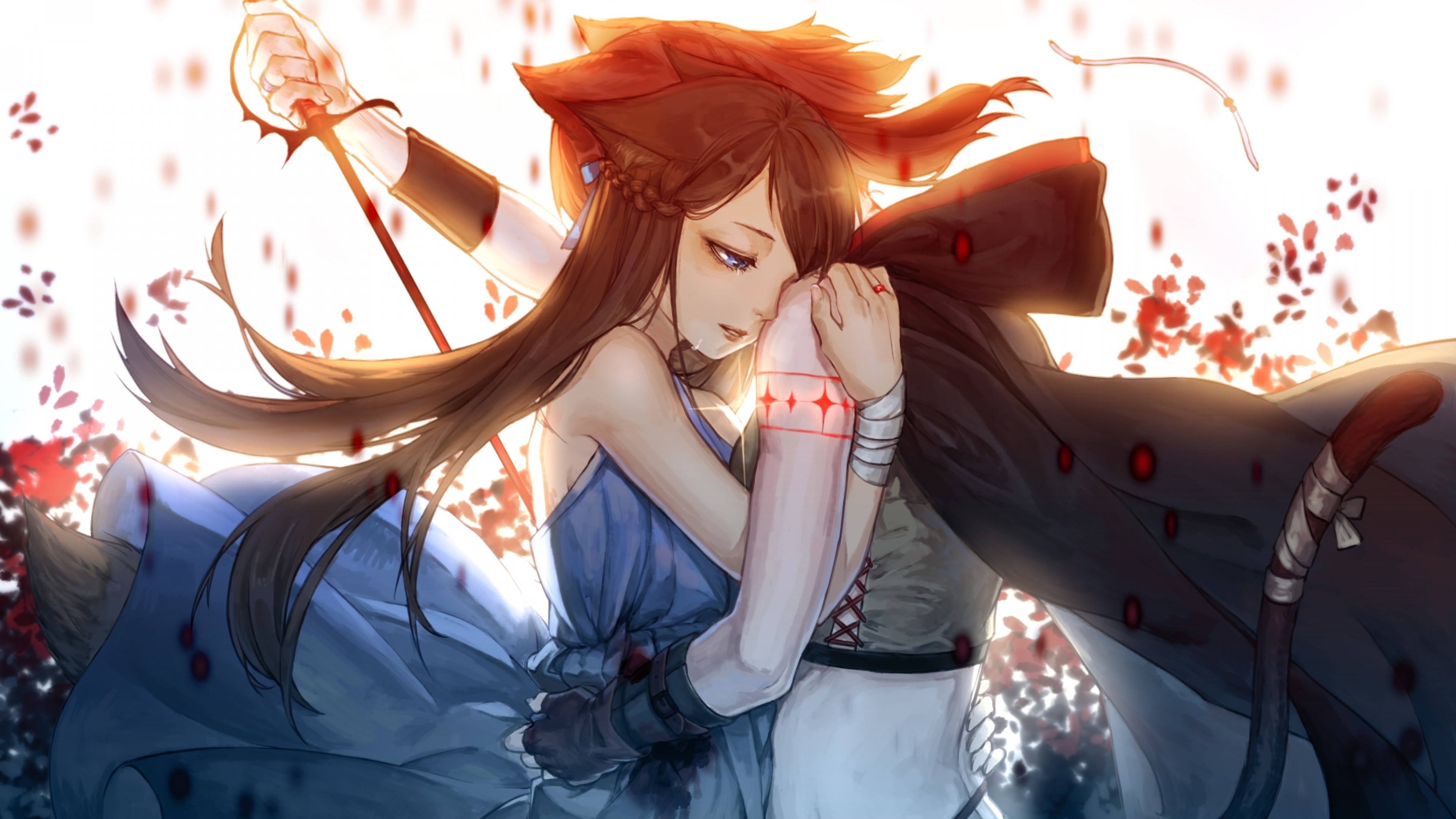 Description: A woman with long hair holding a sword in her hand and wearing a blue dress with red flowers on it.