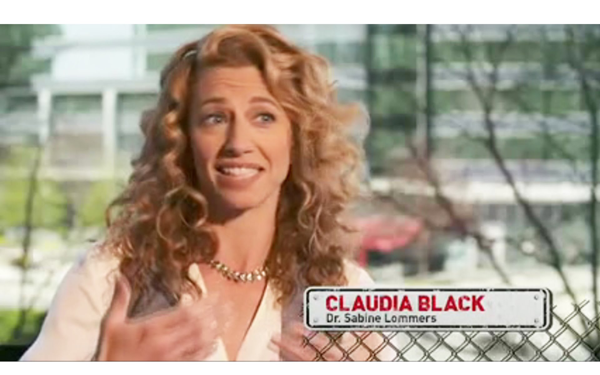 Description: A woman with long hair is talking to someone on a fenced in area with a sign that says claudia black.