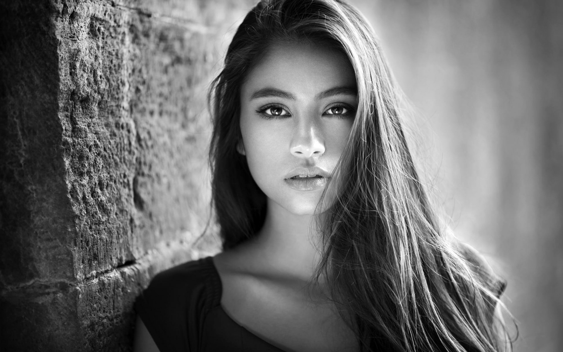 Description: A woman with long hair leaning against a wall with her eyes closed and her hair blowing in the wind.