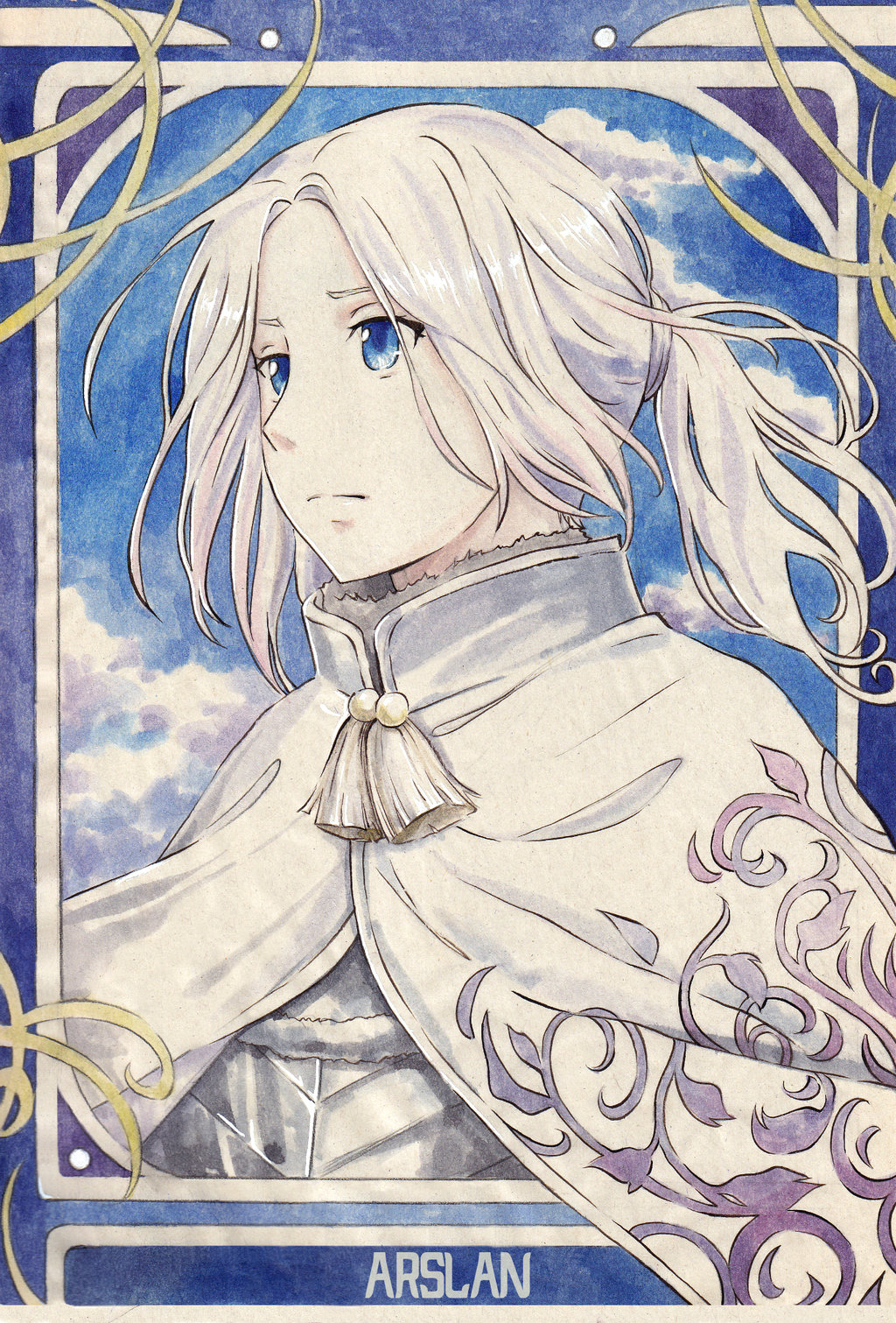 Description: A drawing of a woman with long hair and a white coat on her shoulders and a blue sky in the background.
