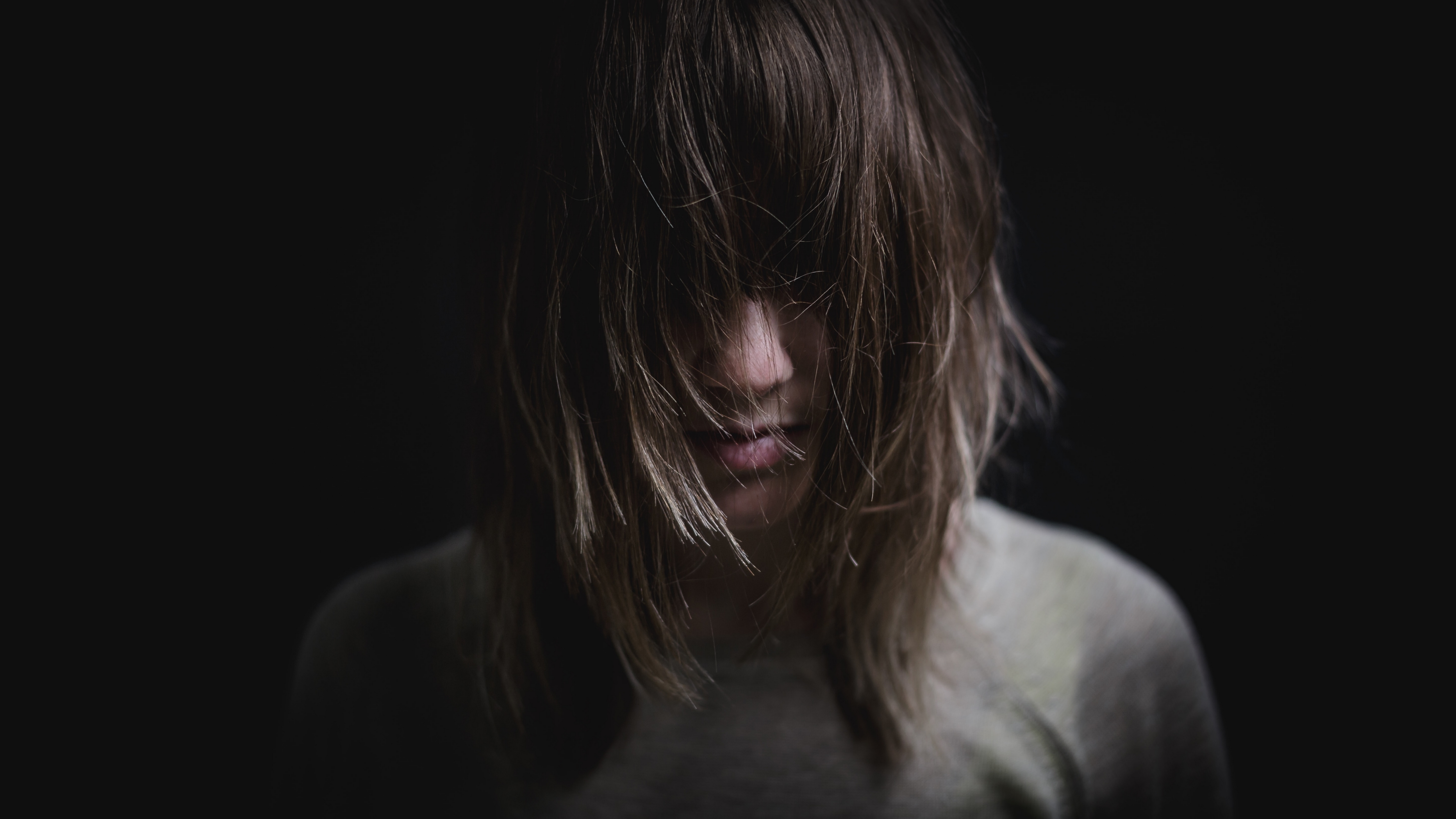 Description: A woman with long hair and a white shirt is looking down at her phone in the dark.