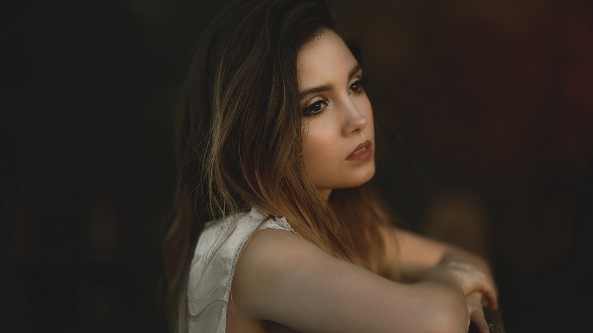 Description: A woman with long hair and a white top is posing for a picture with her arms crossed and her eyes closed.