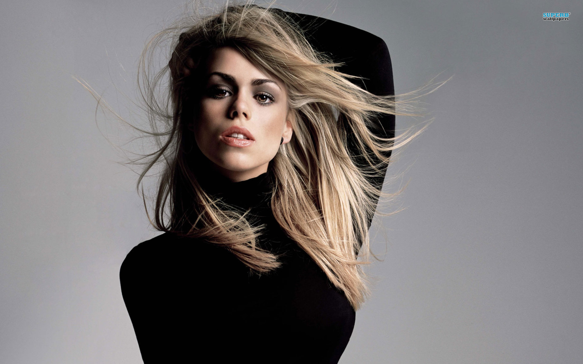 Description: A woman with long hair is posing for a picture with her hair blowing in the wind and her eyes closed.