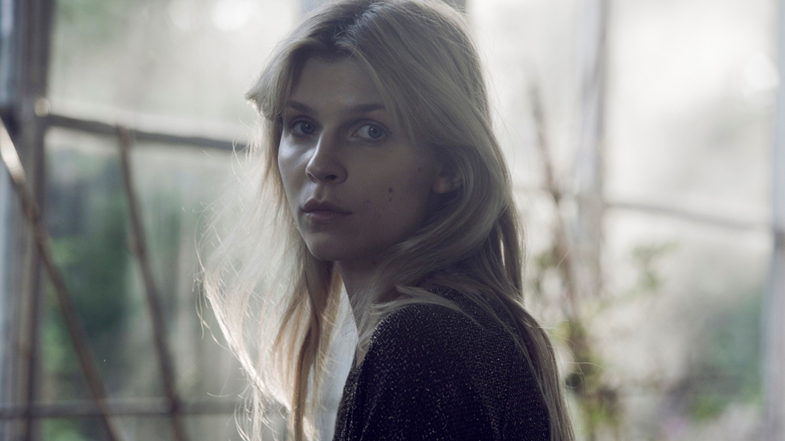 Description: A woman with long hair standing in front of a window looking at something with a serious look on her face.