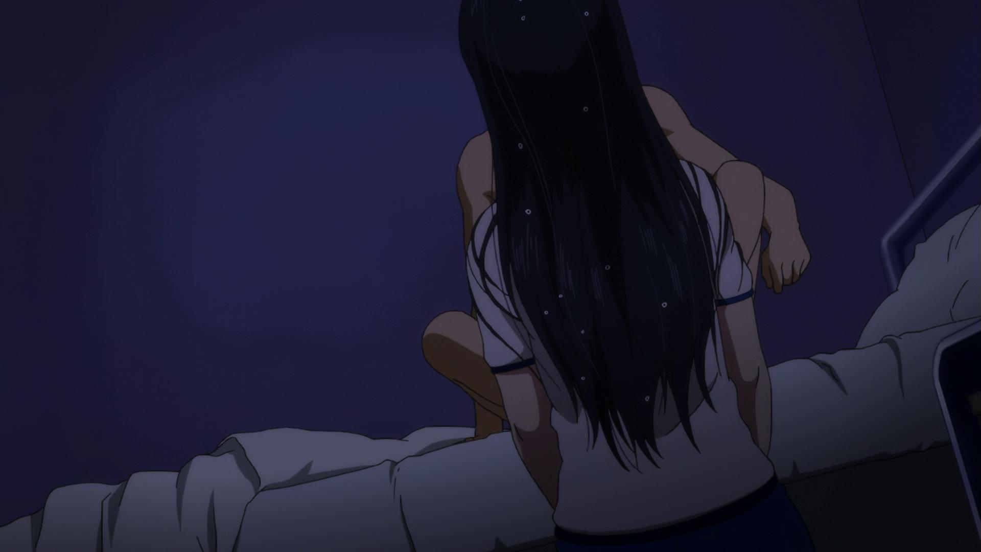 Description: A woman with long hair sitting on a bed in a dark room with a window behind her and a dark wall behind her.