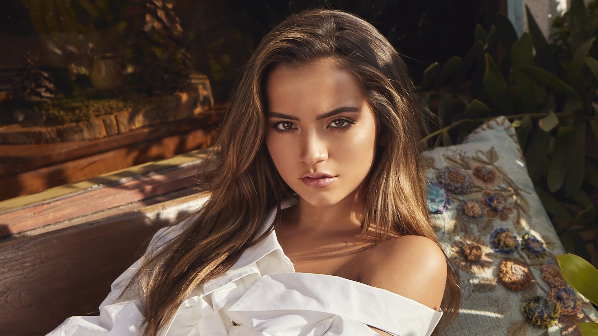 Description: A woman with long hair sitting on a bench in a white shirt and jeans with a flowered pillow behind her.
