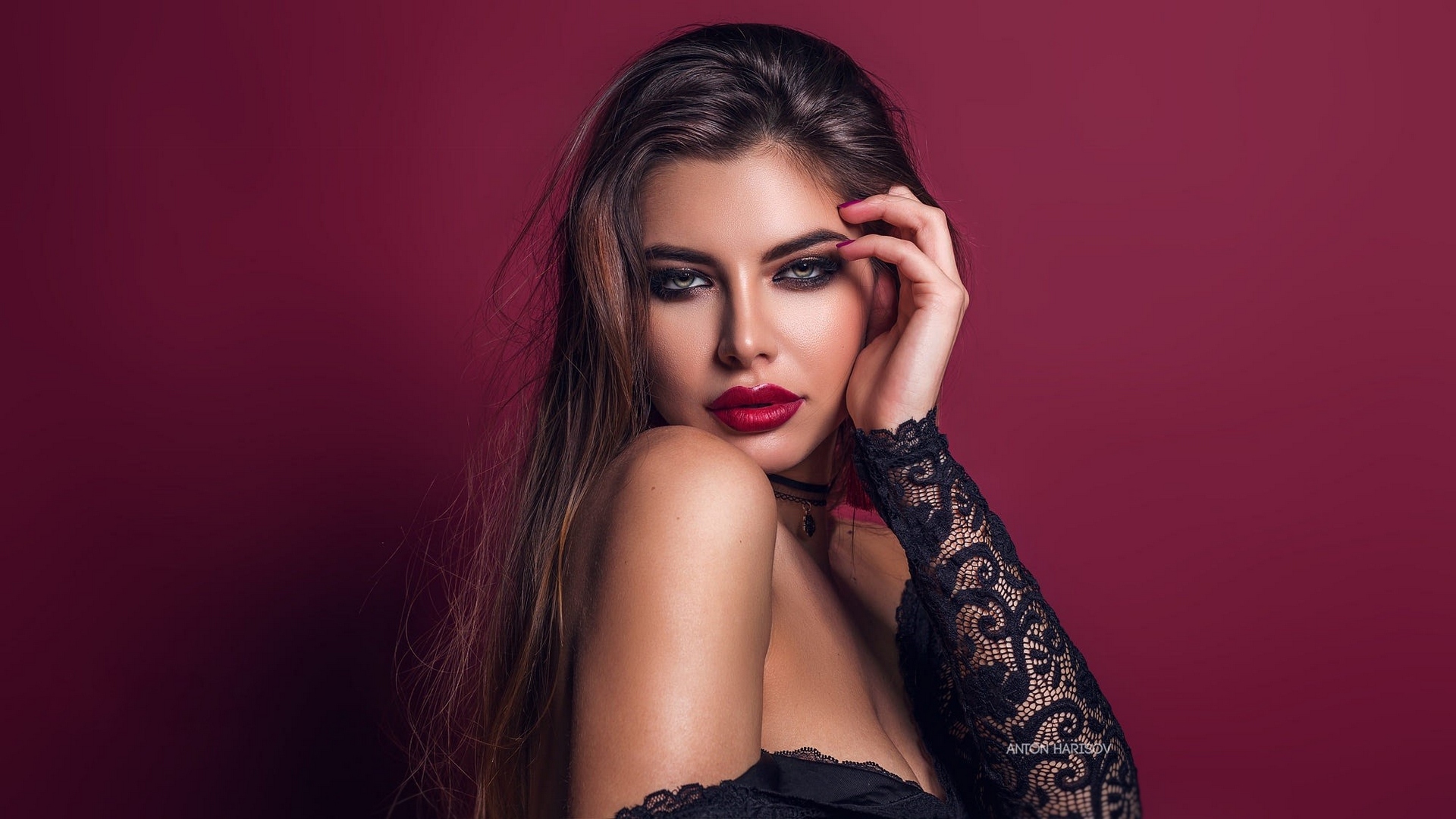 Description: A woman with long hair wearing a black dress and red lipstick posing for a picture with her hands on her head.
