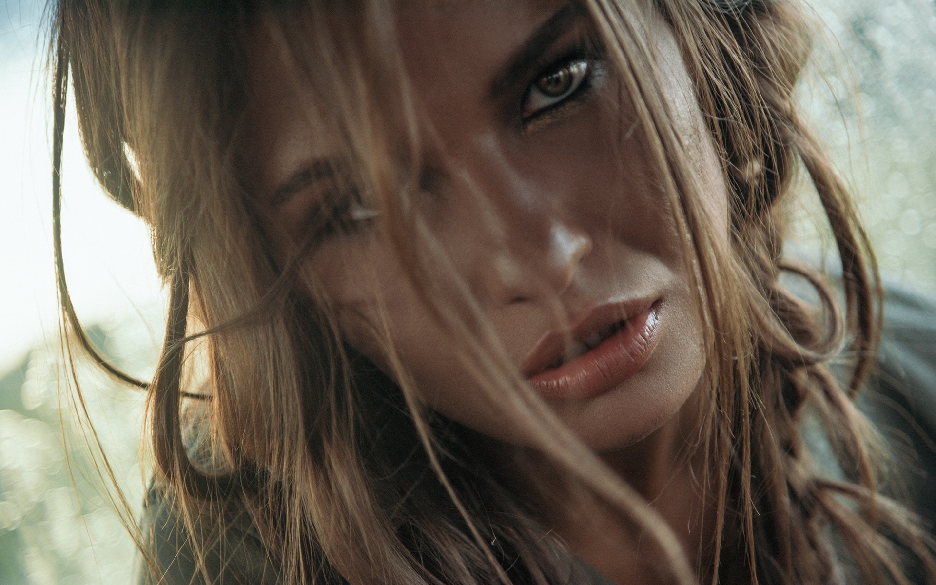 Description: A woman with long hair and a black jacket on is staring at the camera with a serious look on her face.