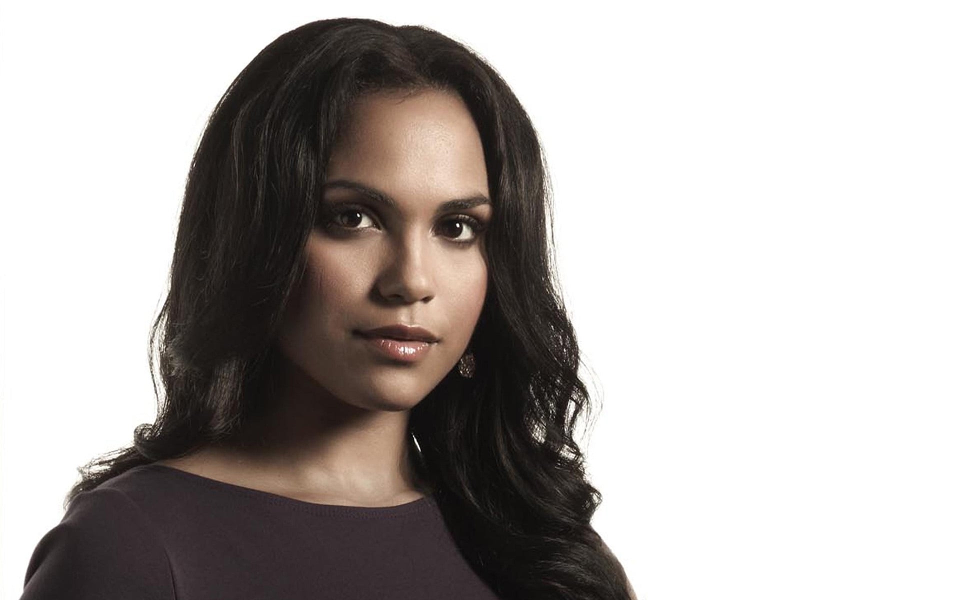 Description: A woman with long hair and a black top on a white background with a white background and a black background.