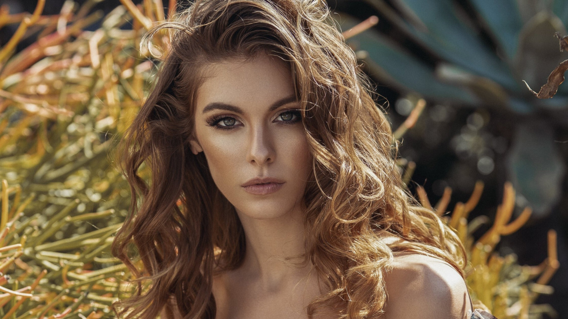 Description: A woman with long hair standing in front of a bush with leaves on it and looking at the camera.
