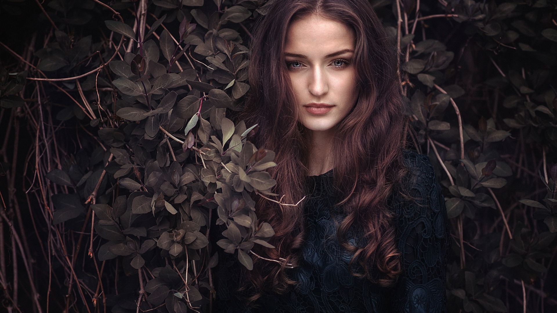 Description: A woman with long hair standing in front of a bush with leaves on it and looking at the camera.
