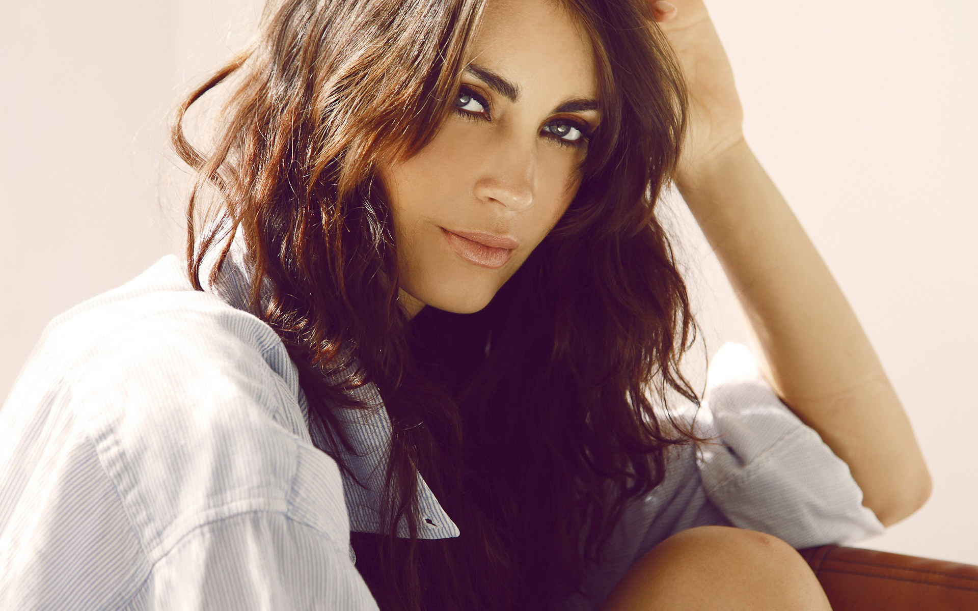 Description: A woman with long hair sitting on a chair with her hands on her head and her eyes closed.