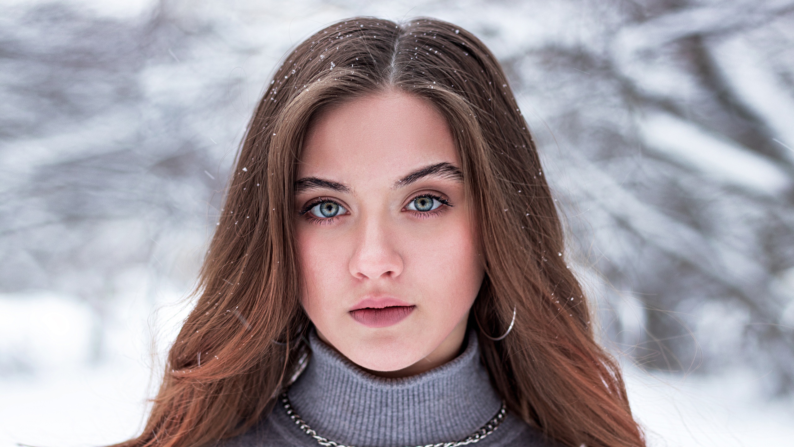 Description: A woman with long hair and a choker on her neck in the snow with trees in the background.