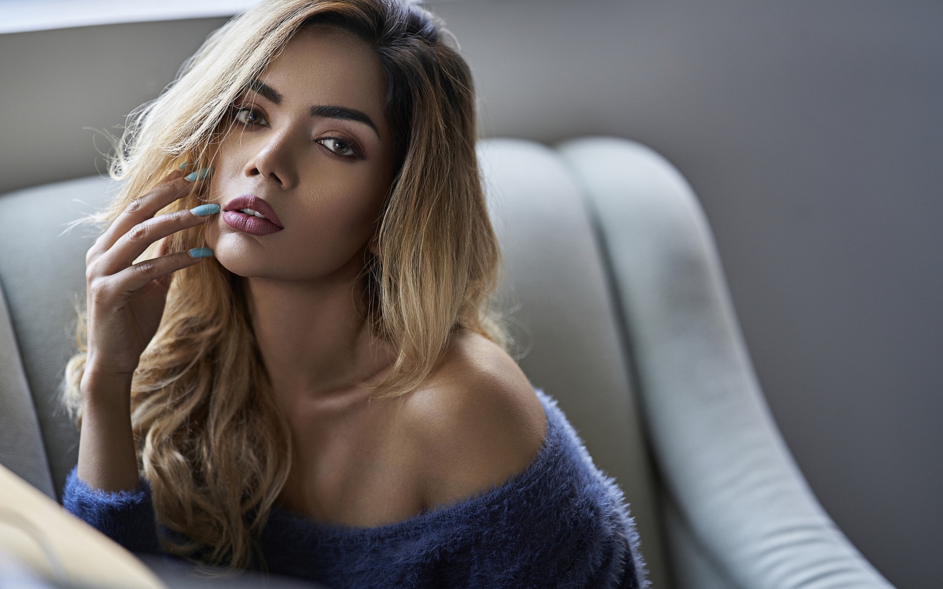 Description: A woman with long hair sitting on a couch with a blue sweater on and a ring in her hand.