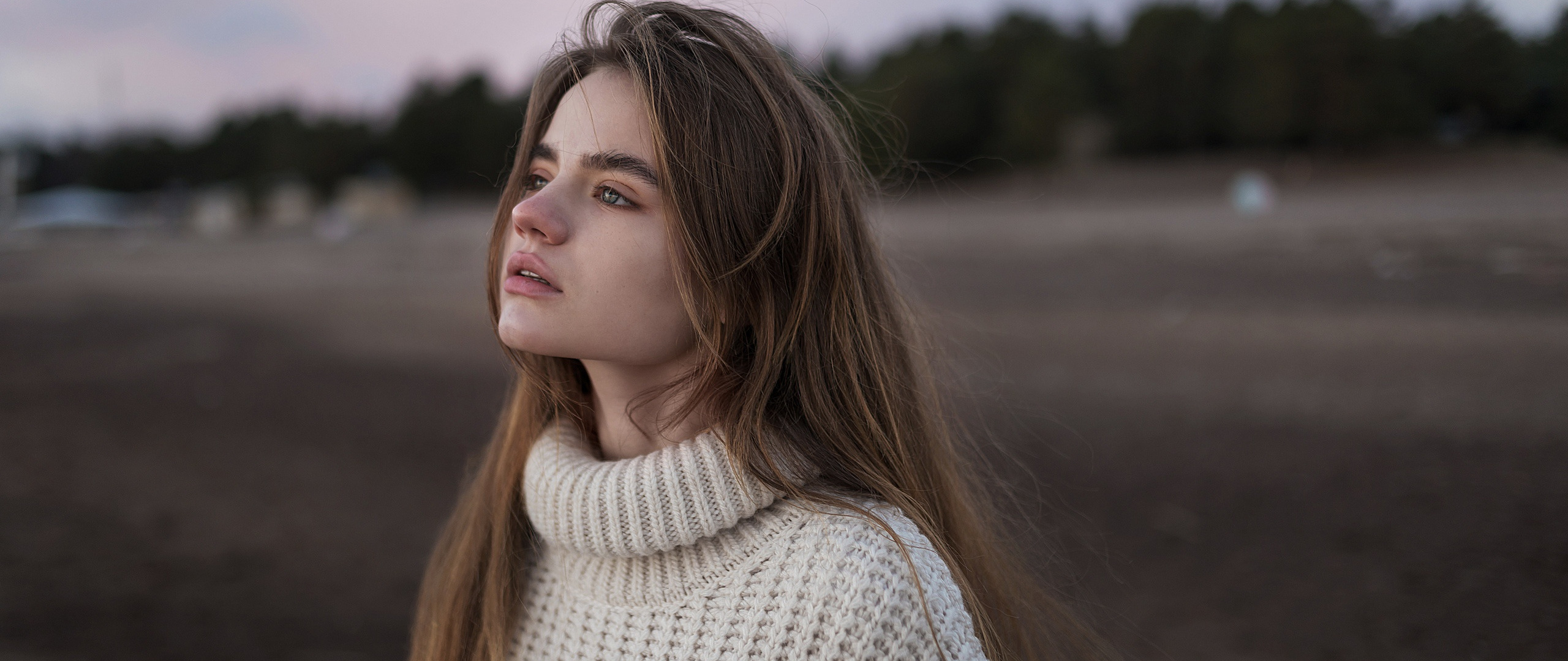Description: A woman with long hair standing in a field with trees in the background and a sky in the background.