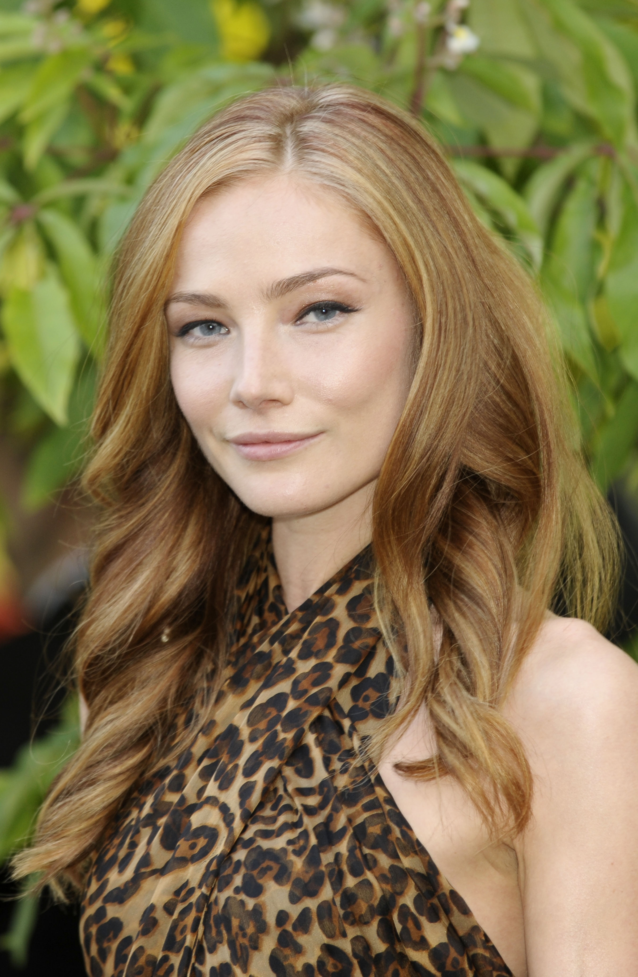 Description: A woman with long hair and a leopard print top posing for a picture in front of a bush of flowers.