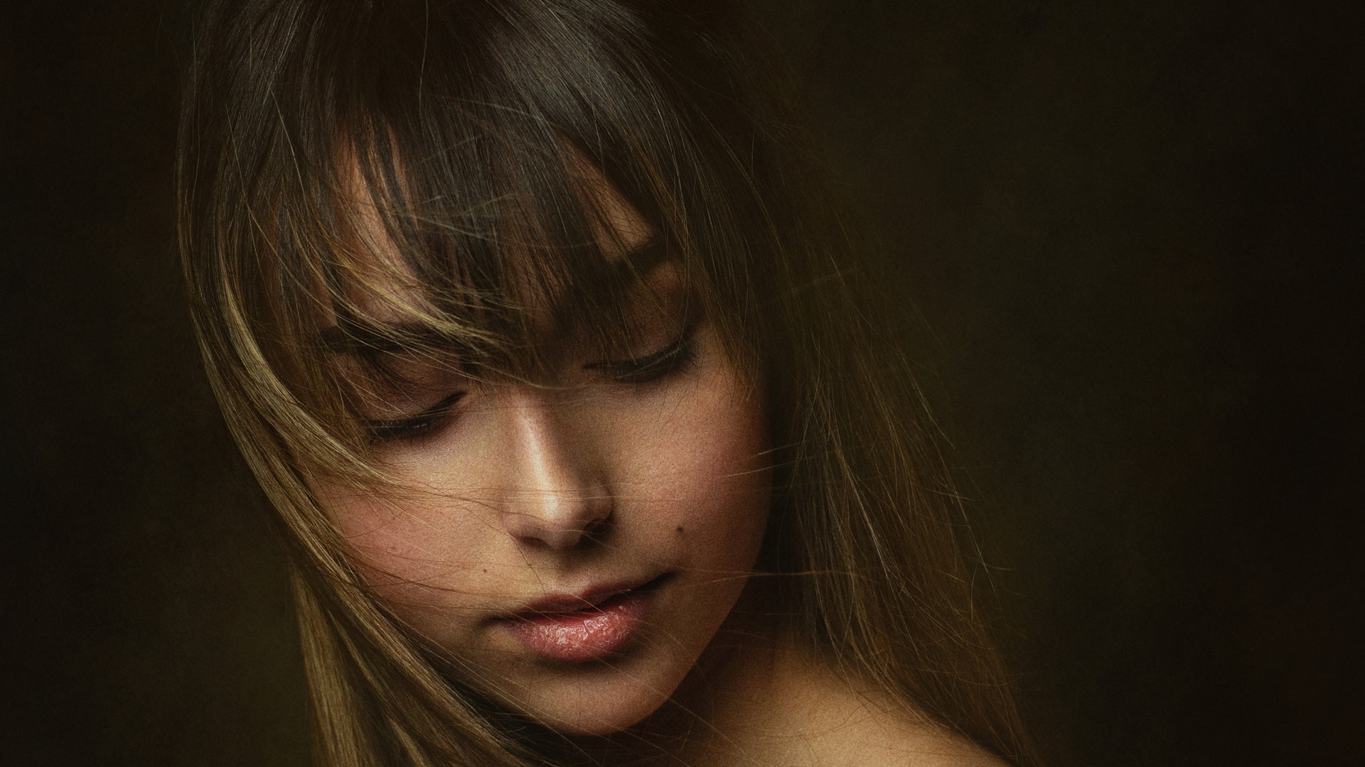 Description: A woman with long hair is looking down at her cell phone while she is holding her head down and her eyes closed.