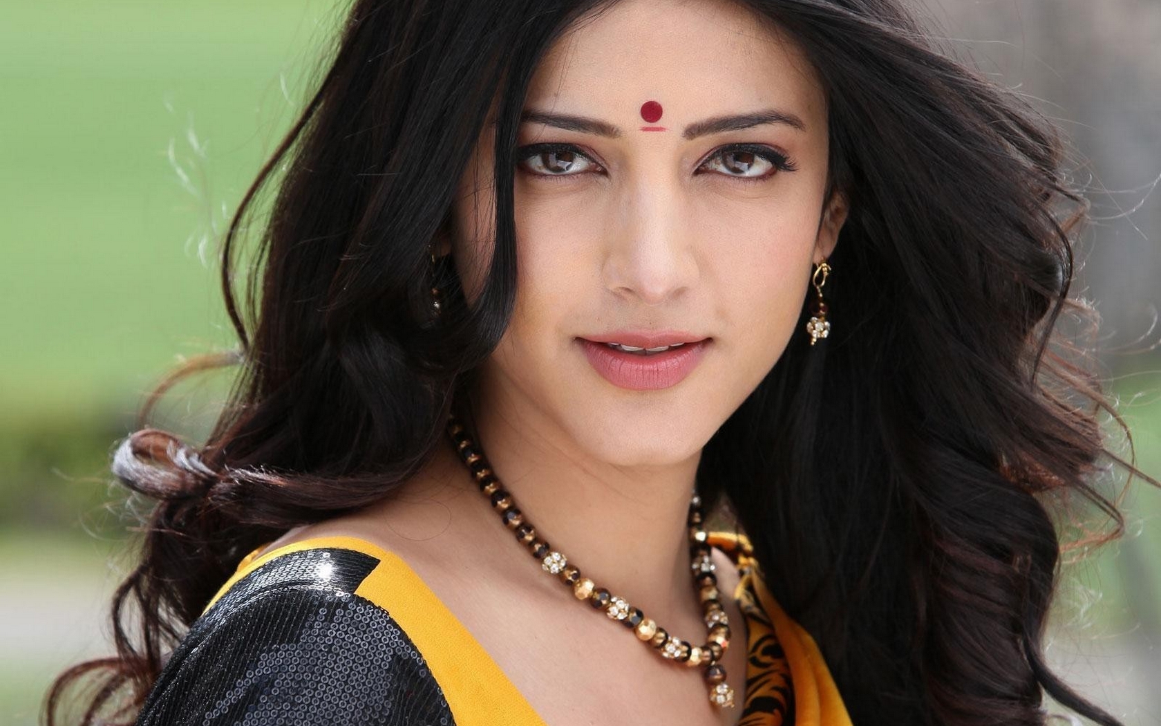 Description: A woman with long hair wearing a necklace and a yellow top with a green field in the background and a tree.