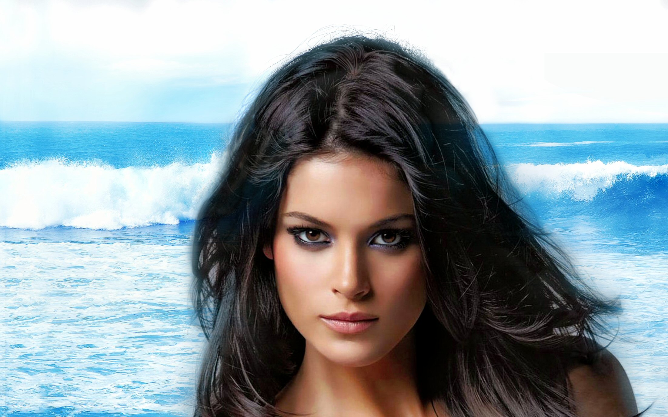 Description: A woman with long hair standing in front of a wave in the ocean with a blue sky and clouds.
