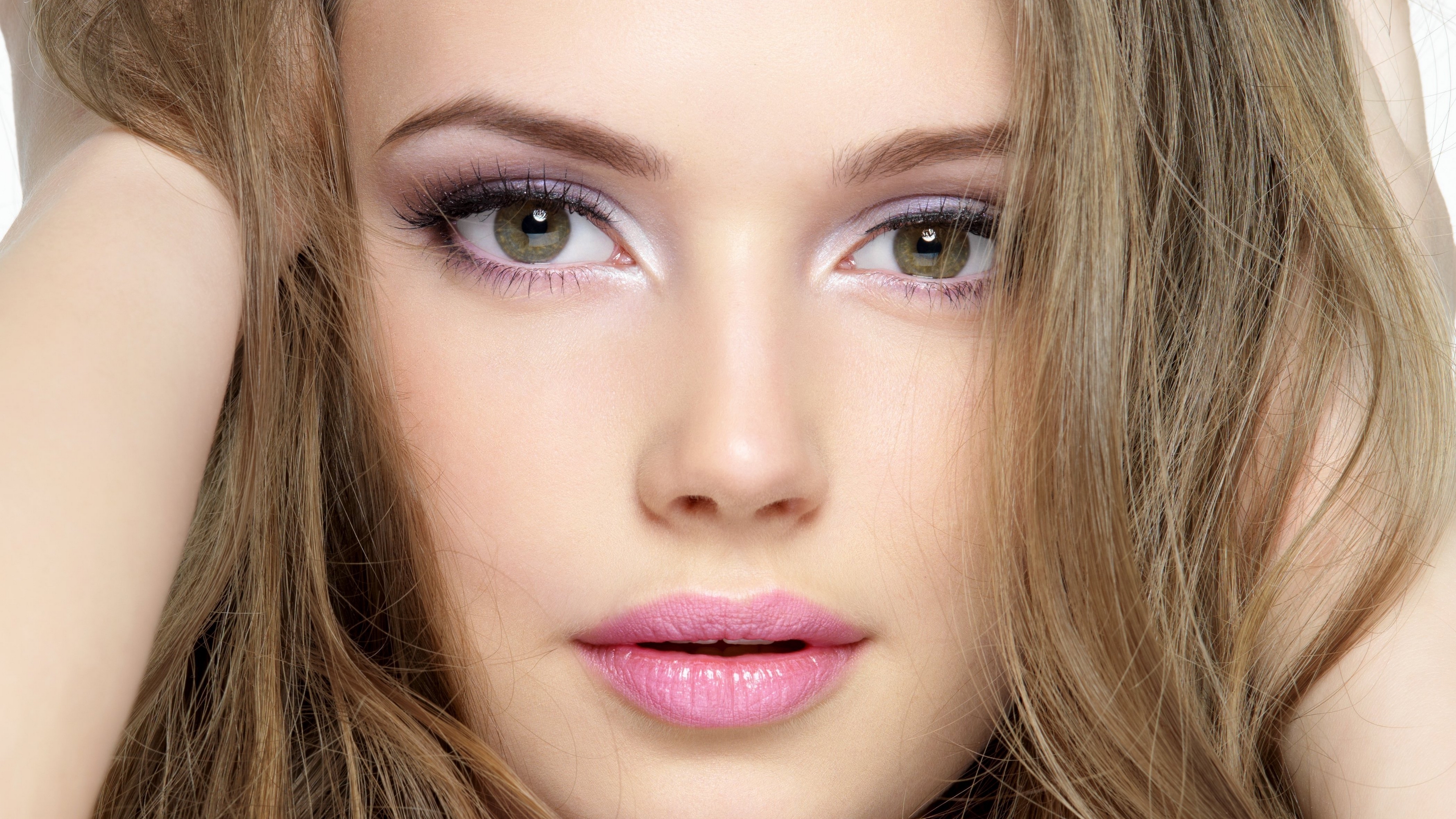 Description: A woman with long hair and a pink lip is posing for a picture with her hands on her head.