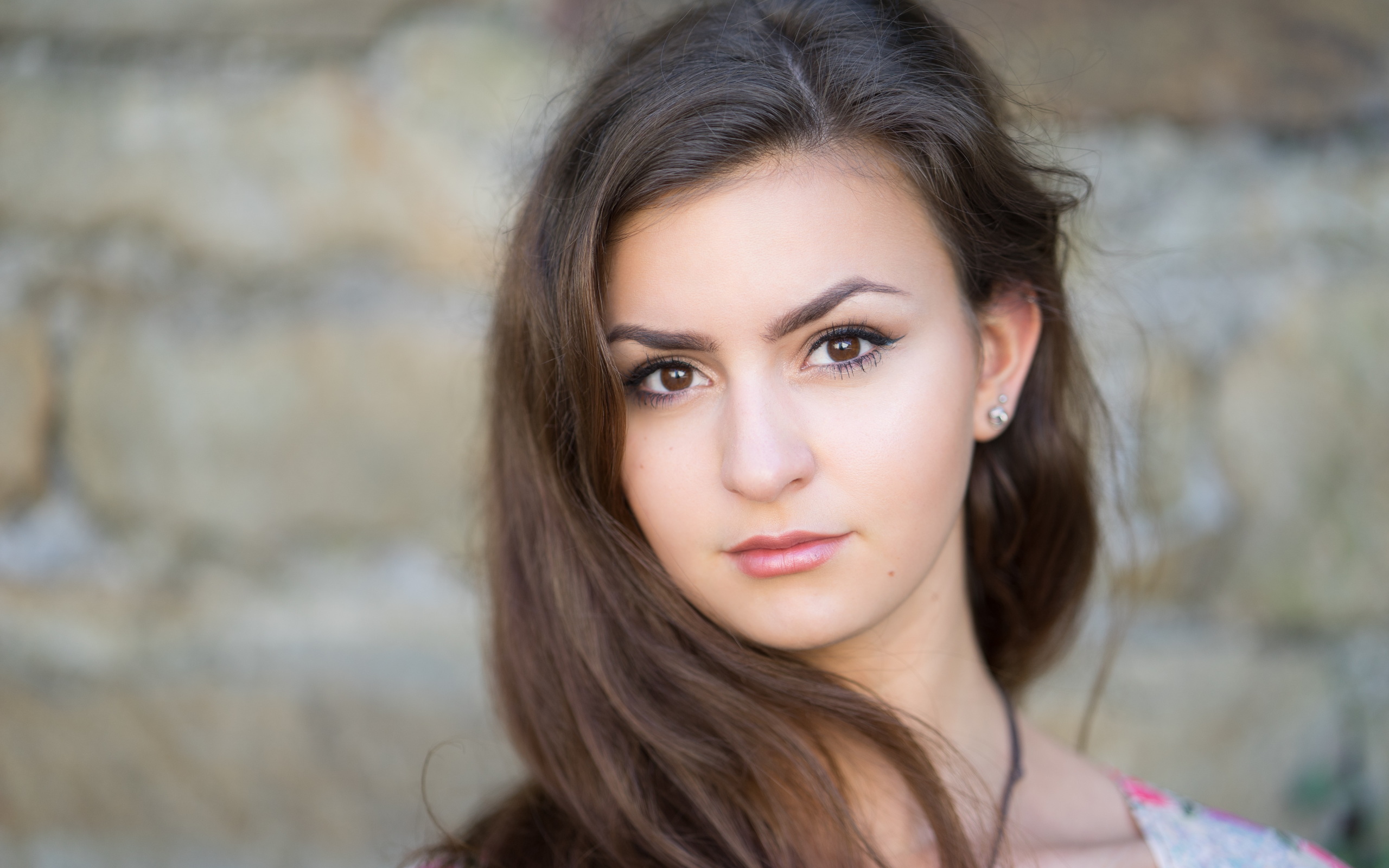 Description: A woman with long hair and a pink shirt is posing for a picture with a stone wall behind her.