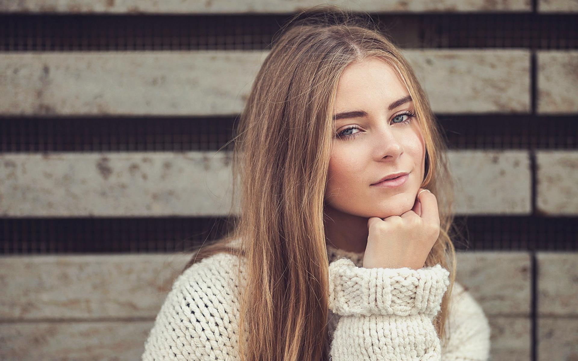Description: A woman with long hair is posing for a picture with her hand on her chin and looking off to the side.