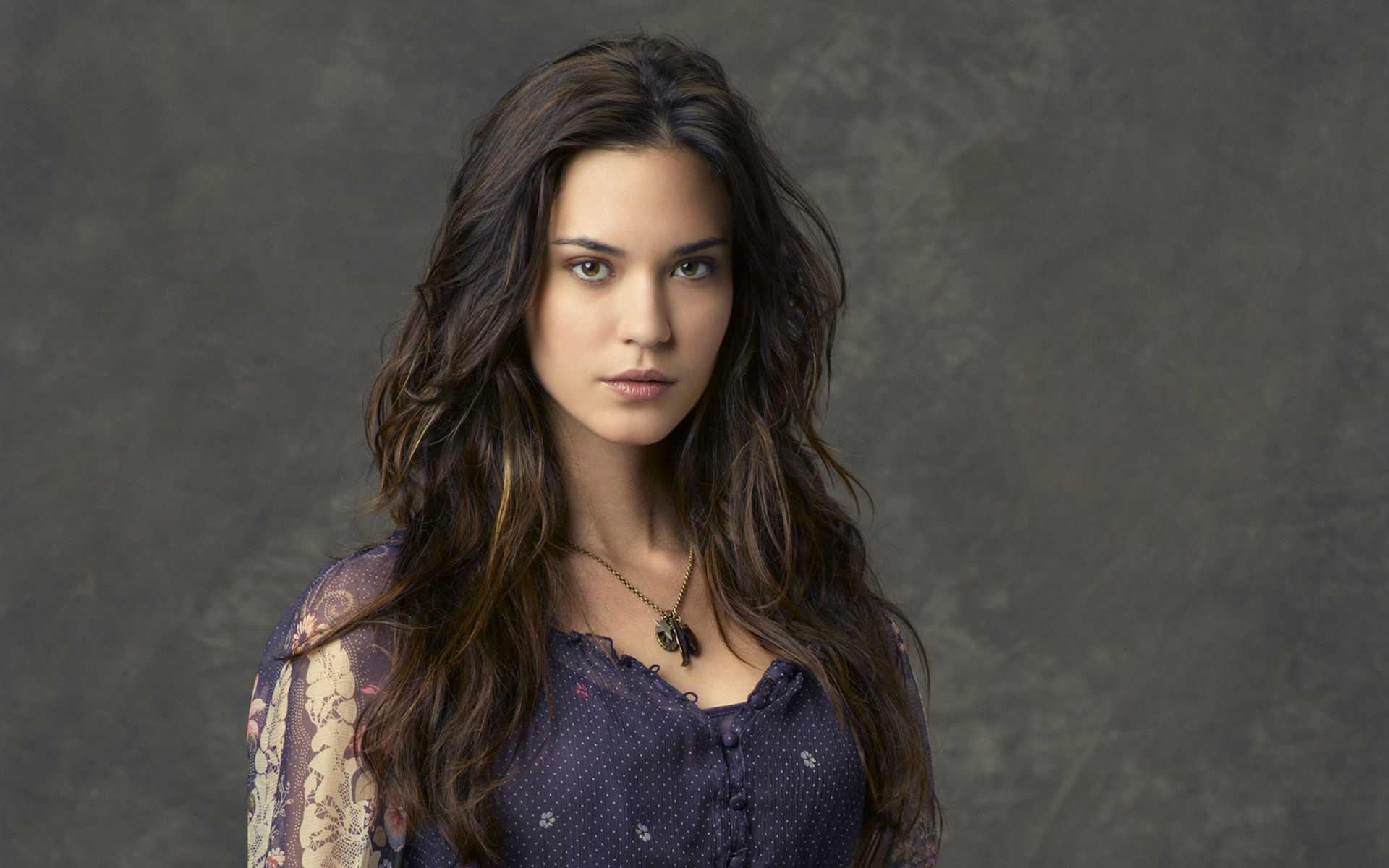 Description: A woman with long hair and a purple shirt is posing for a picture with a gray background and a black background.