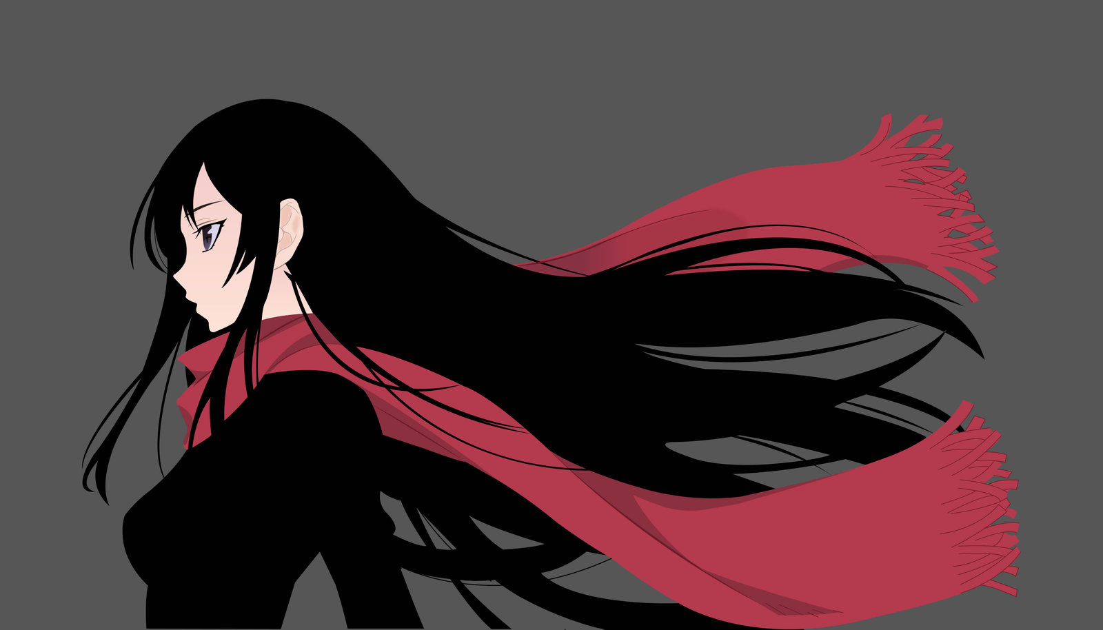 Description: A woman with long hair and a red scarf on her head is looking at something in the distance with her eyes closed.