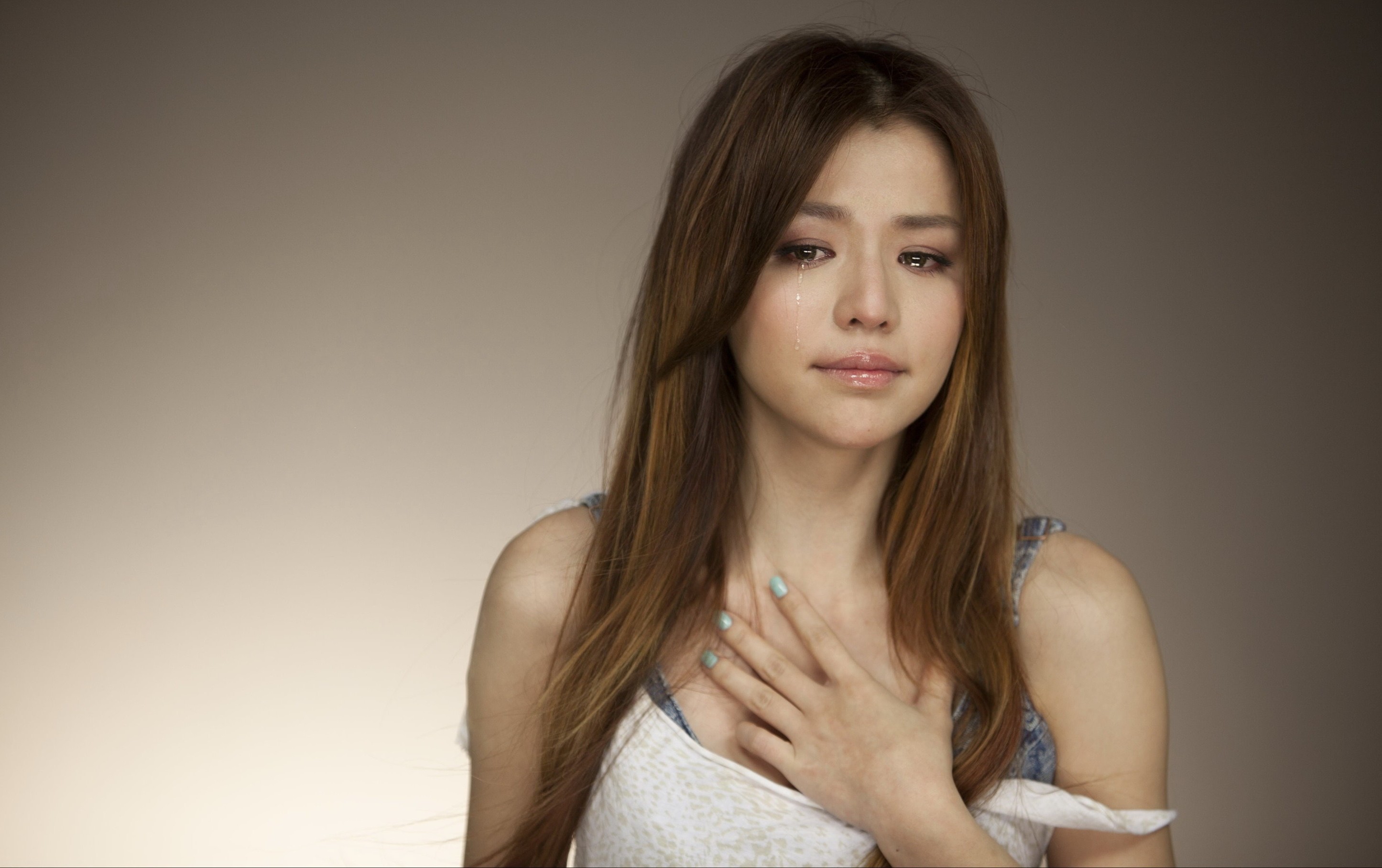 Description: A woman with long hair and a ring on her finger is posing for a picture with her hands on her chest.