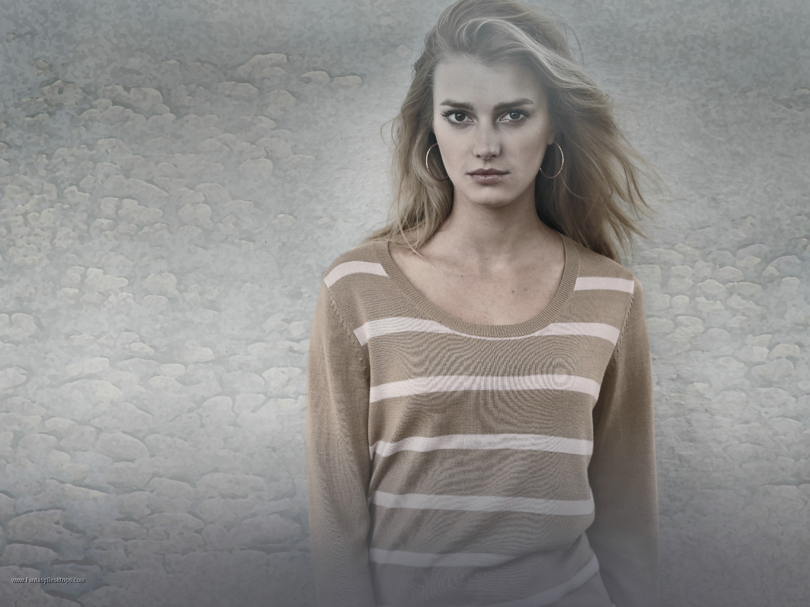 Description: A woman with long hair standing in front of a wall with rocks on it and a gray background with a white stripe.