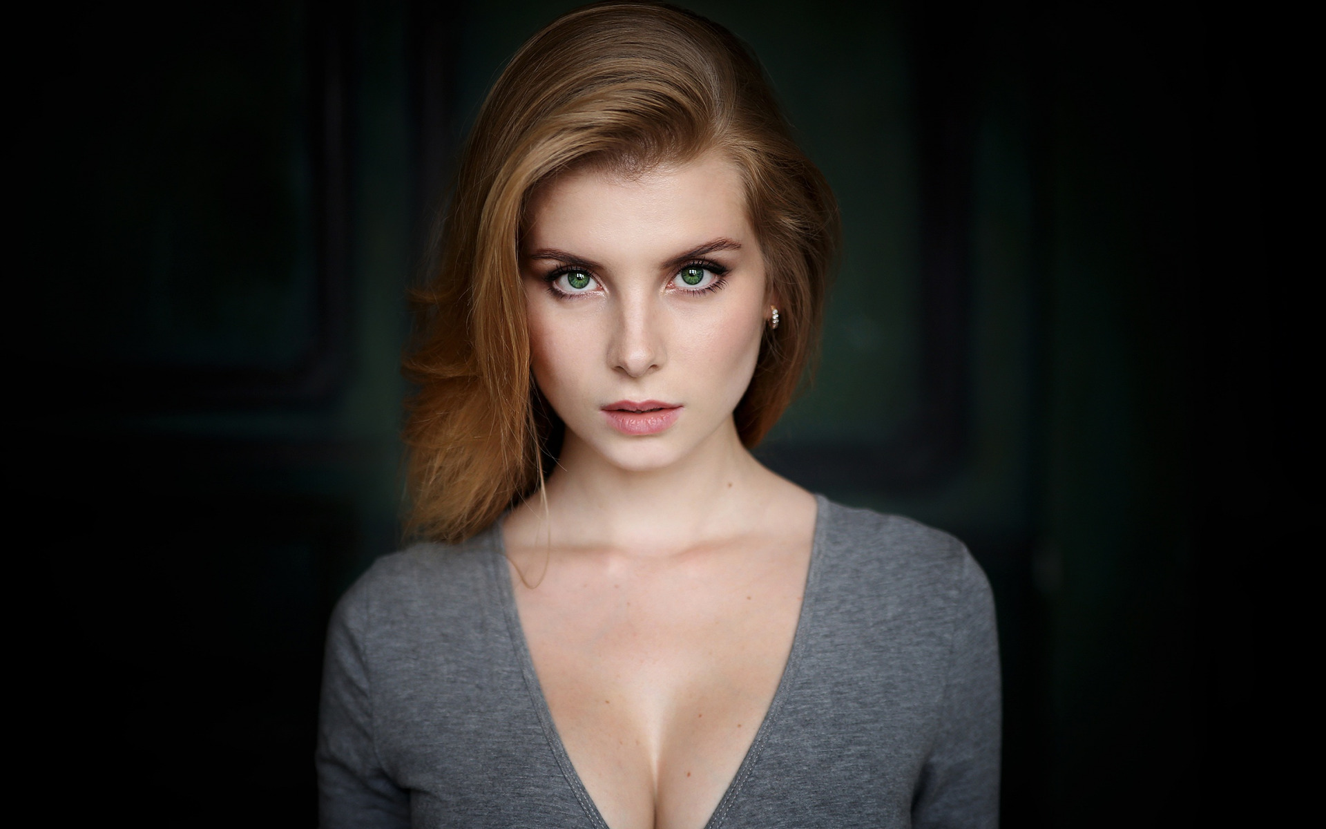 Description: A woman with a very large breast and a very long haircut with a serious look on her face.