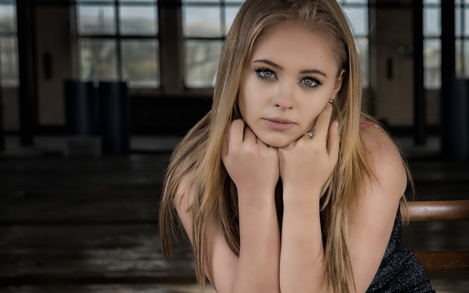 Description: A woman with long hair sitting on a chair in a room with windows and a floor lamp in front of her.