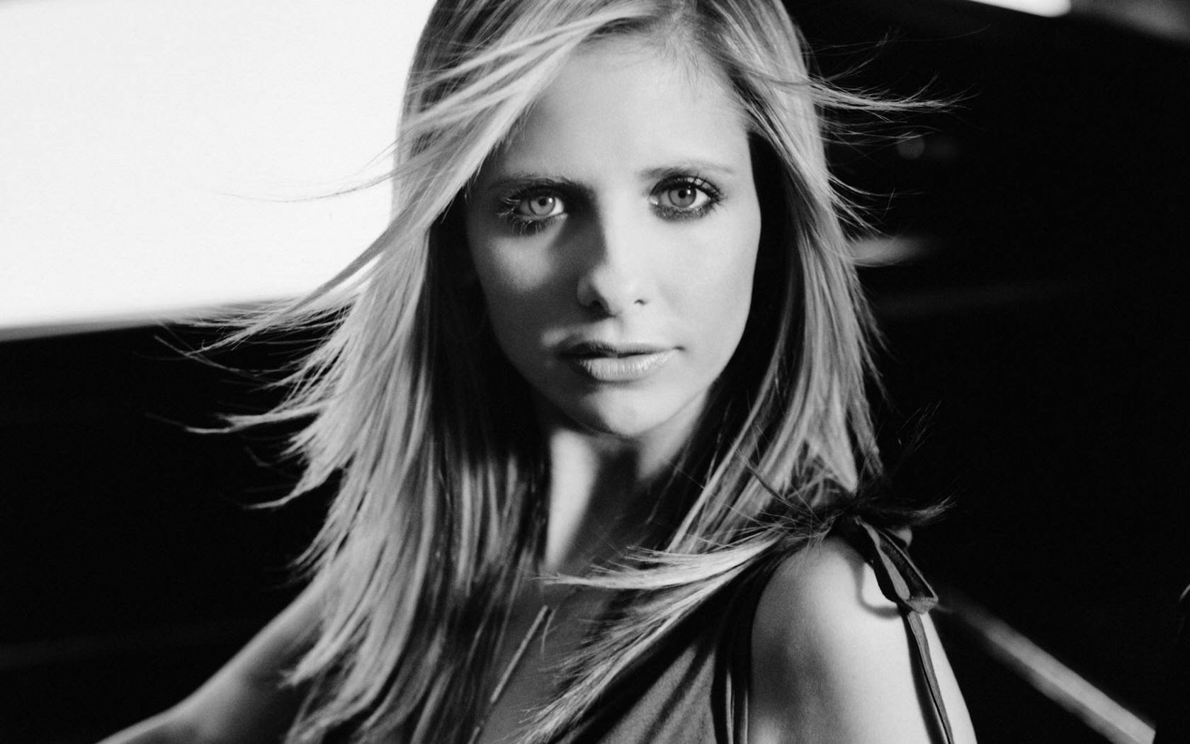 Description: A woman with long hair and a tie around her neck posing for a picture in a black and white photo.