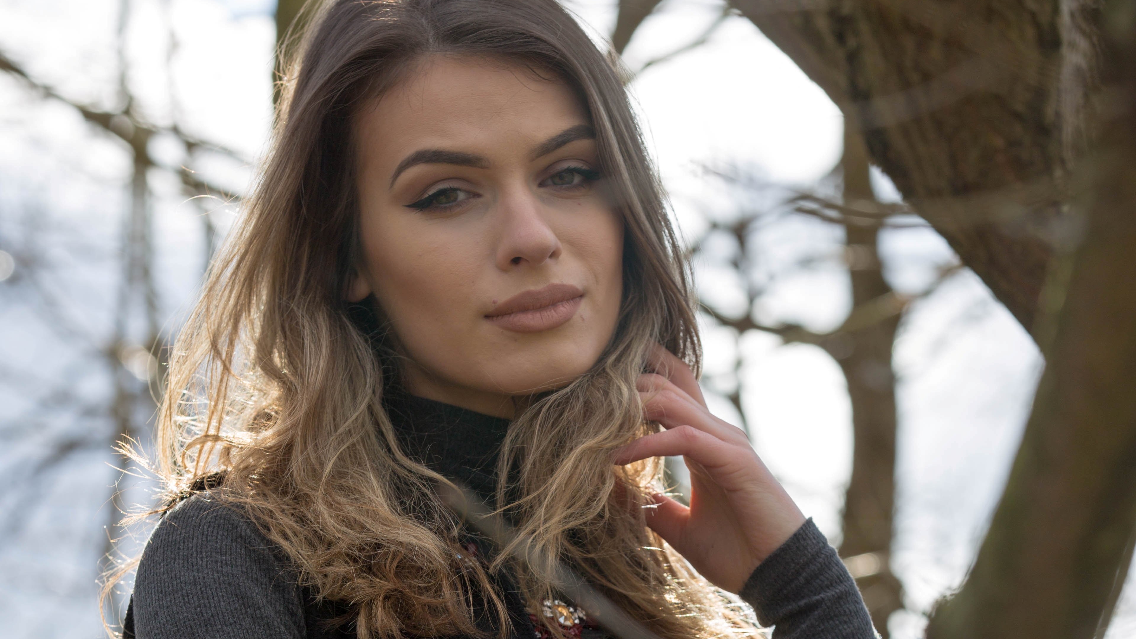 Description: A woman with long hair is standing near a tree and talking on a cell phone with a serious look on her face.