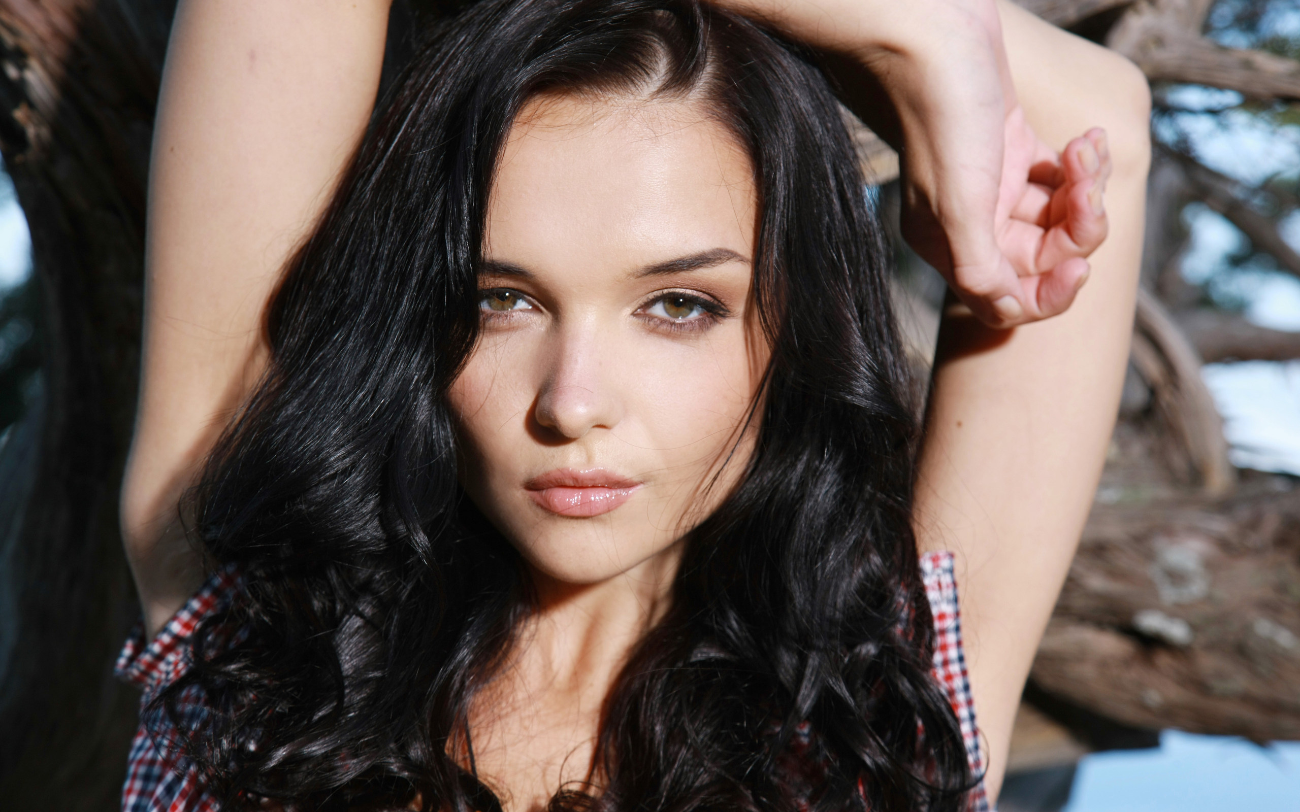 Description: A woman with long hair posing for a picture in front of a tree branch with her hand on her head.
