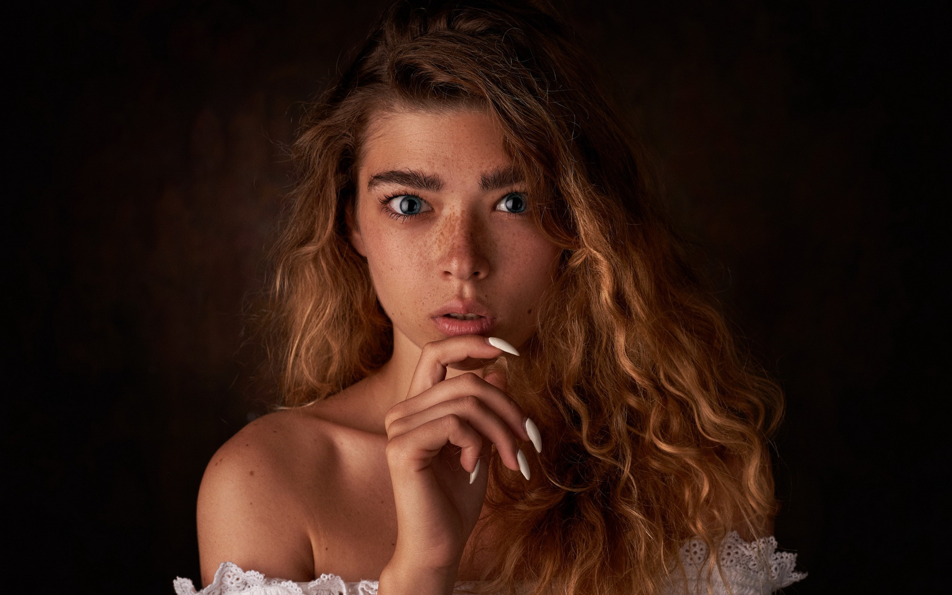 Description: A woman with long hair and a white dress is posing for a picture with her hand on her chin.