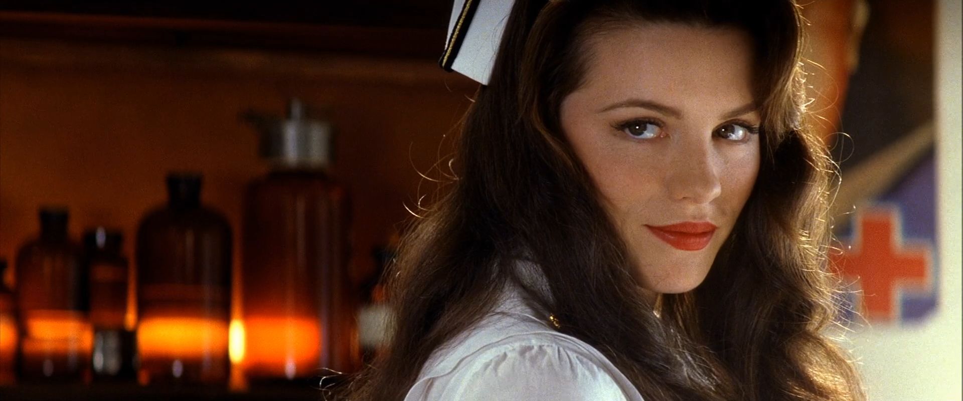 Description: A woman with long hair and a white shirt is posing for a picture in a kitchen with bottles on the wall.