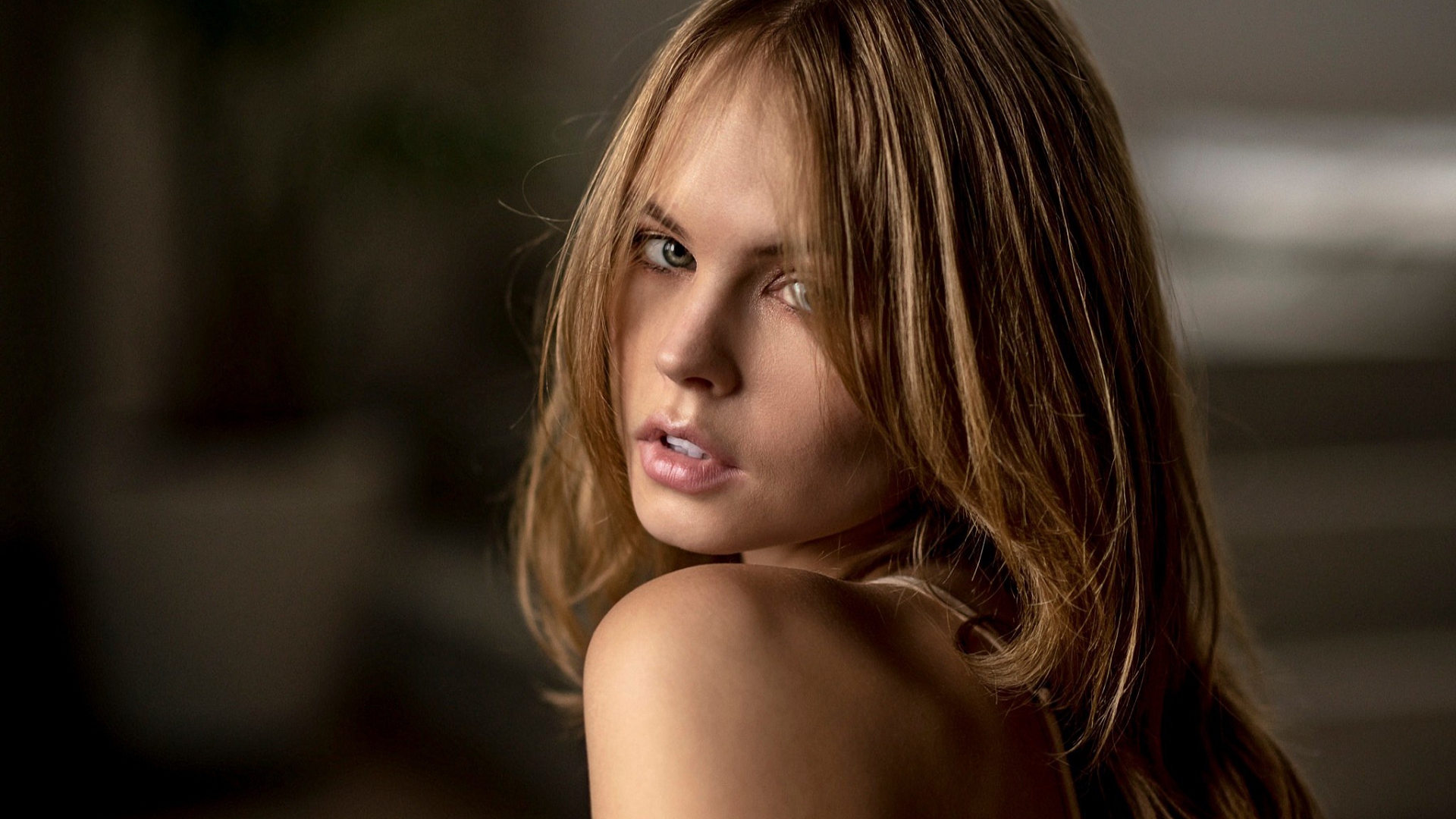 Description: A woman with long hair and a white shirt on posing for a picture with a dark background and a white wall.