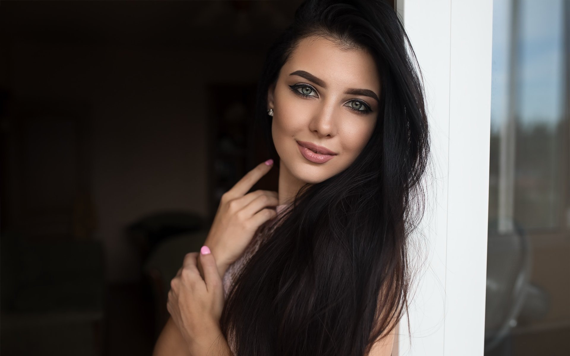 Description: A woman with long hair standing next to a window with a pink nail polish on her fingernails.