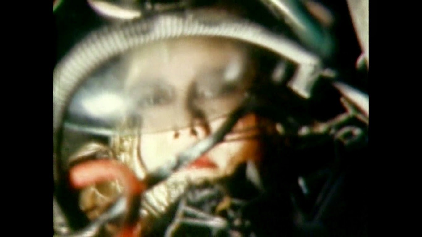 Description: A woman is looking through a mirror with her eyes closed and her head in the mirror.